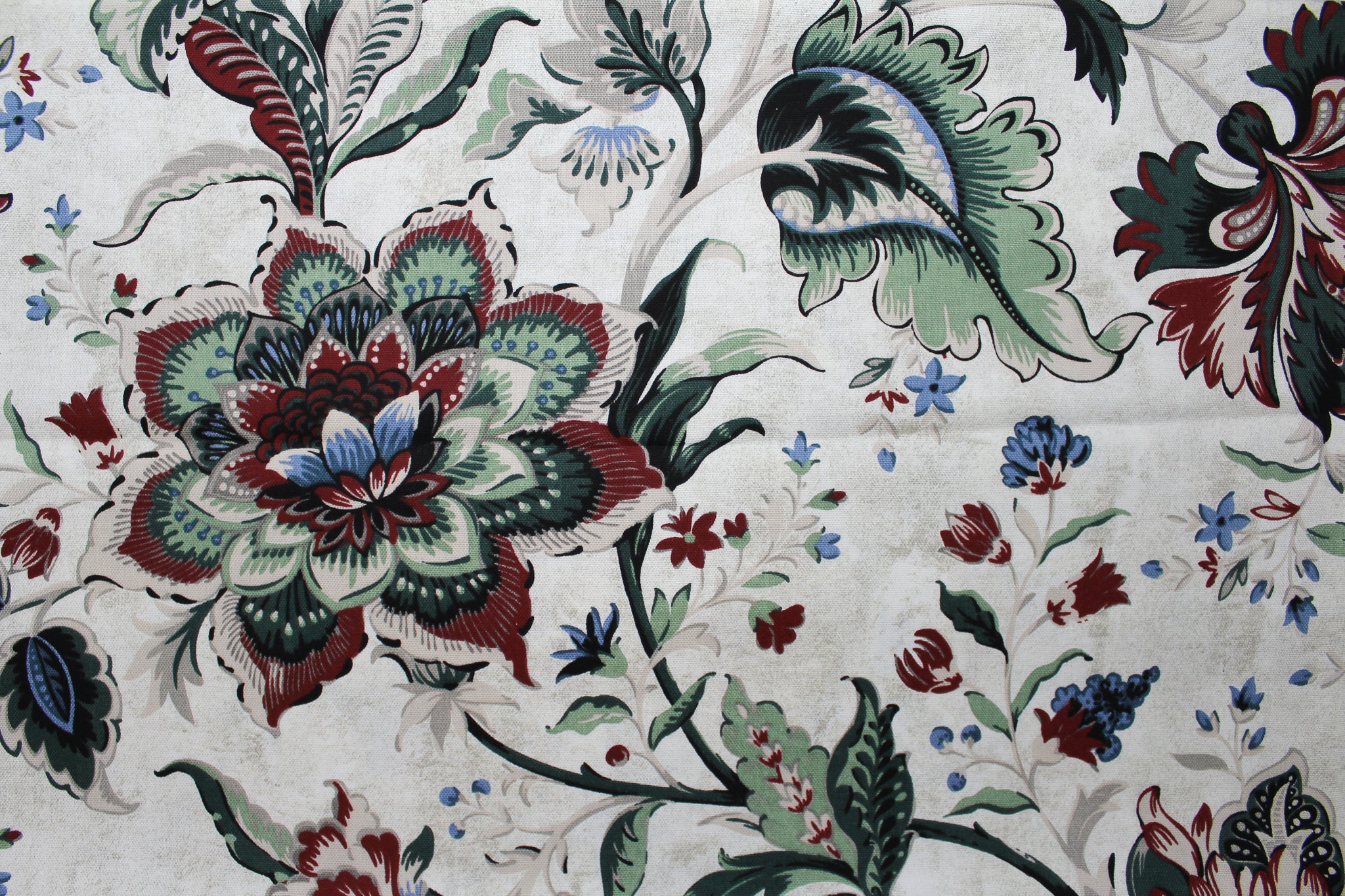 Large cool-toned florals in red, blue, green, and gray colors on gray/beige background.