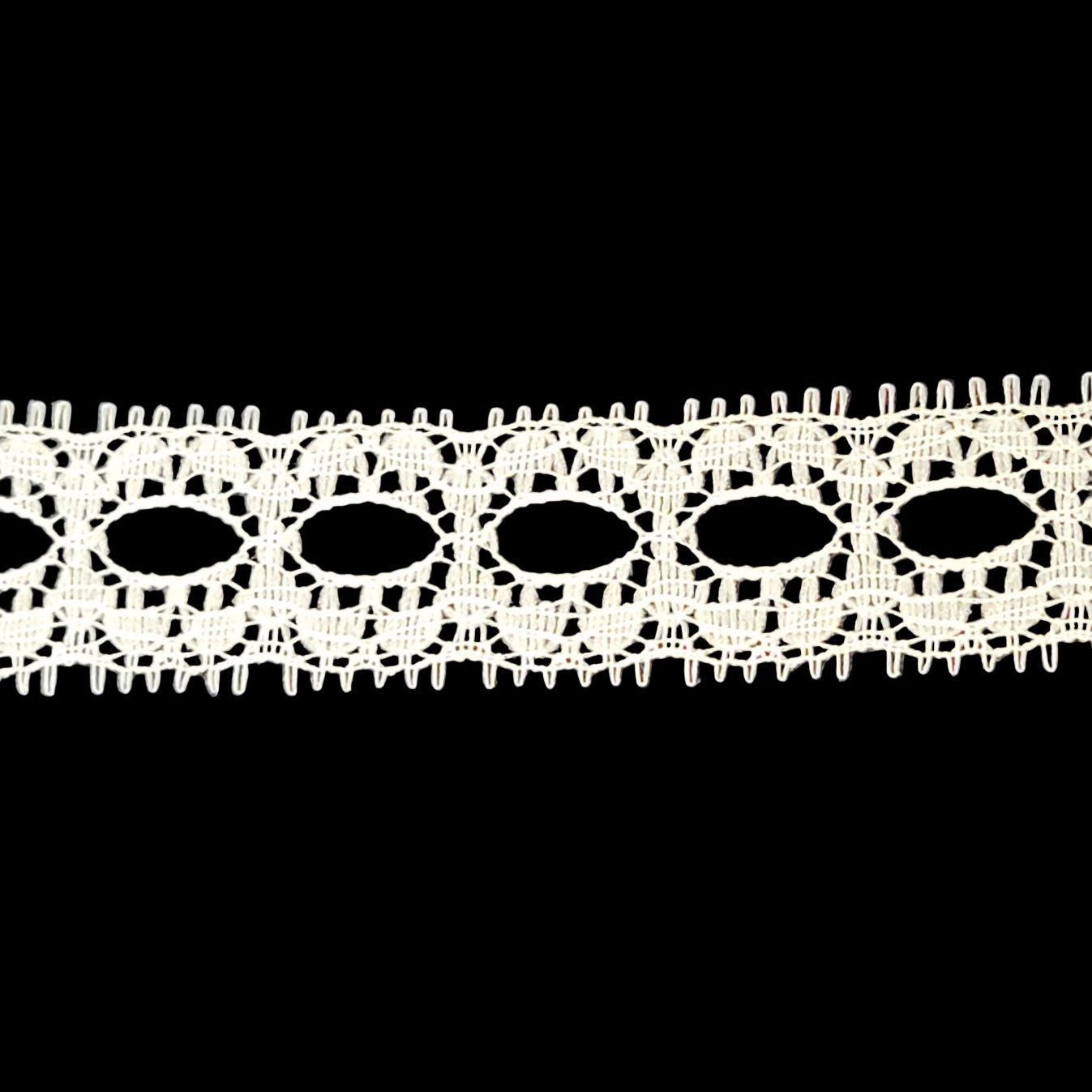 This is a recovered lace trim. Ivory lace with staggered openings in the middle of the lace. This is where beads can be sewn/added. Each side has tiny loop fringe. There are no beads on the lace currently.