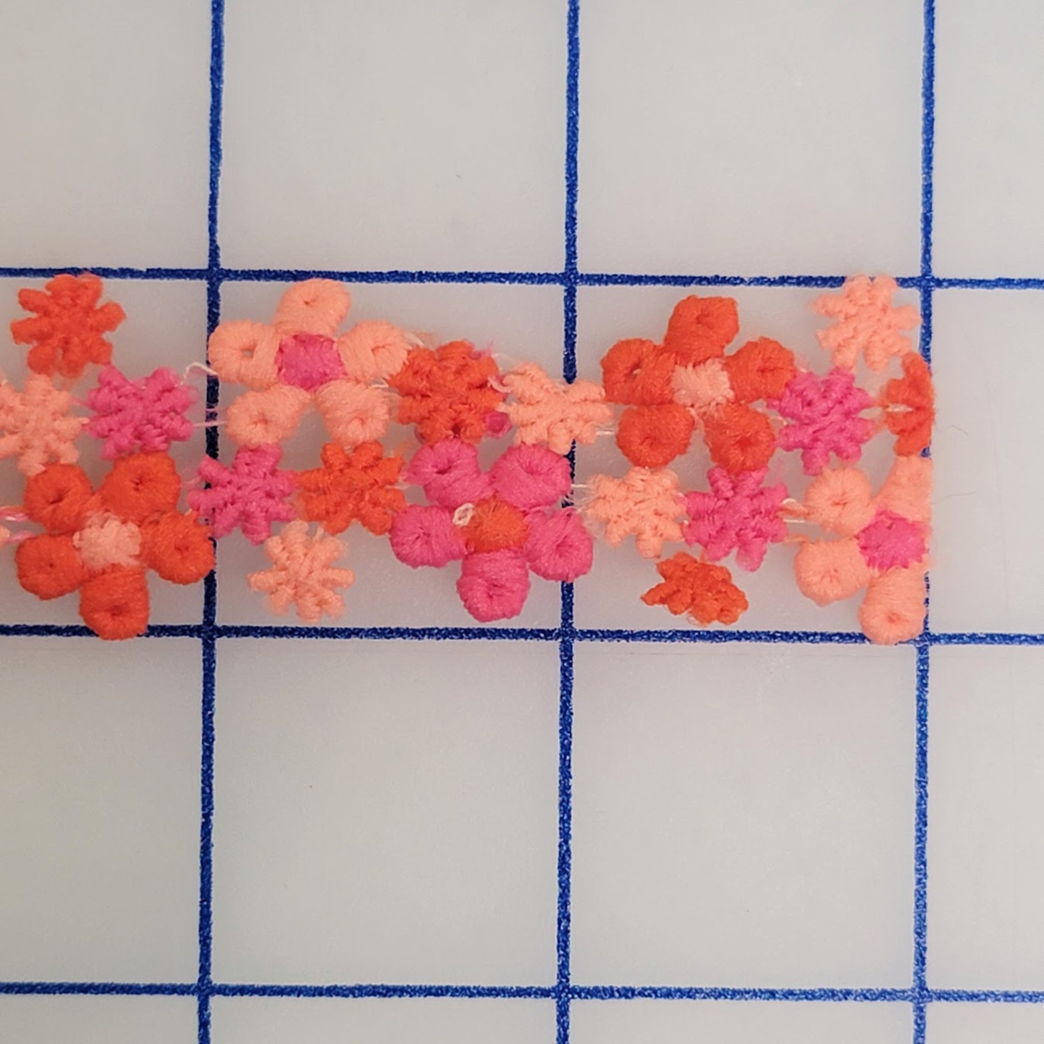 This is a recovered floral trim. The trim features a variety of orange and pink flowers in the design.