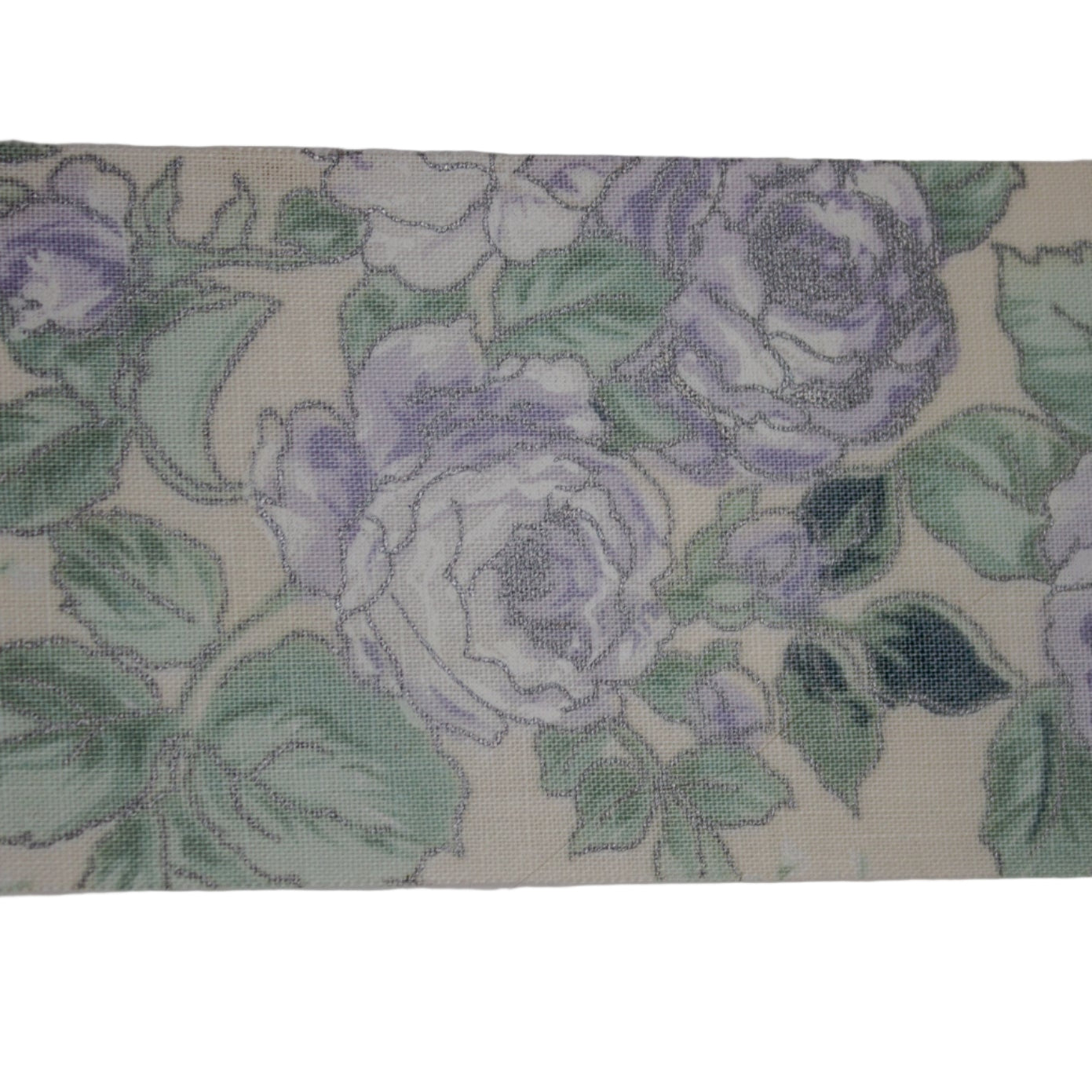 This is a recovered ribbon. Cream ribbon decorated with pastel purple peonies outlined in silver metallic thread.