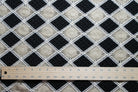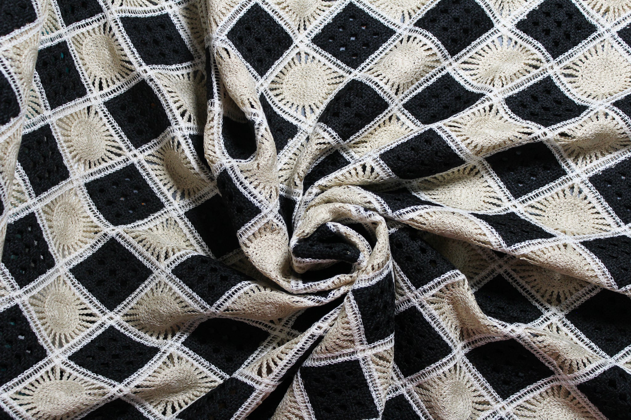 Black and tan crochet design. Material is see-through. Open holes between the lines of crochet (note the gray background is the mat below the fabric).