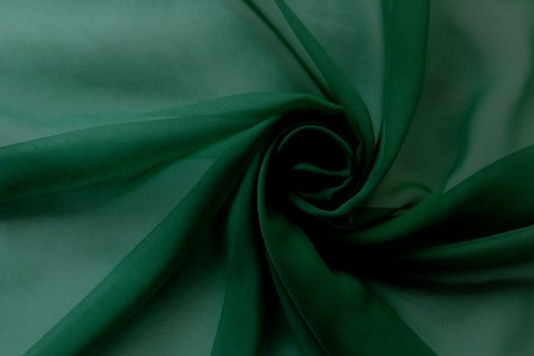 A sheer, light weight, soft and flowing, Hunter Green chiffon fabric with a wonderful drape.