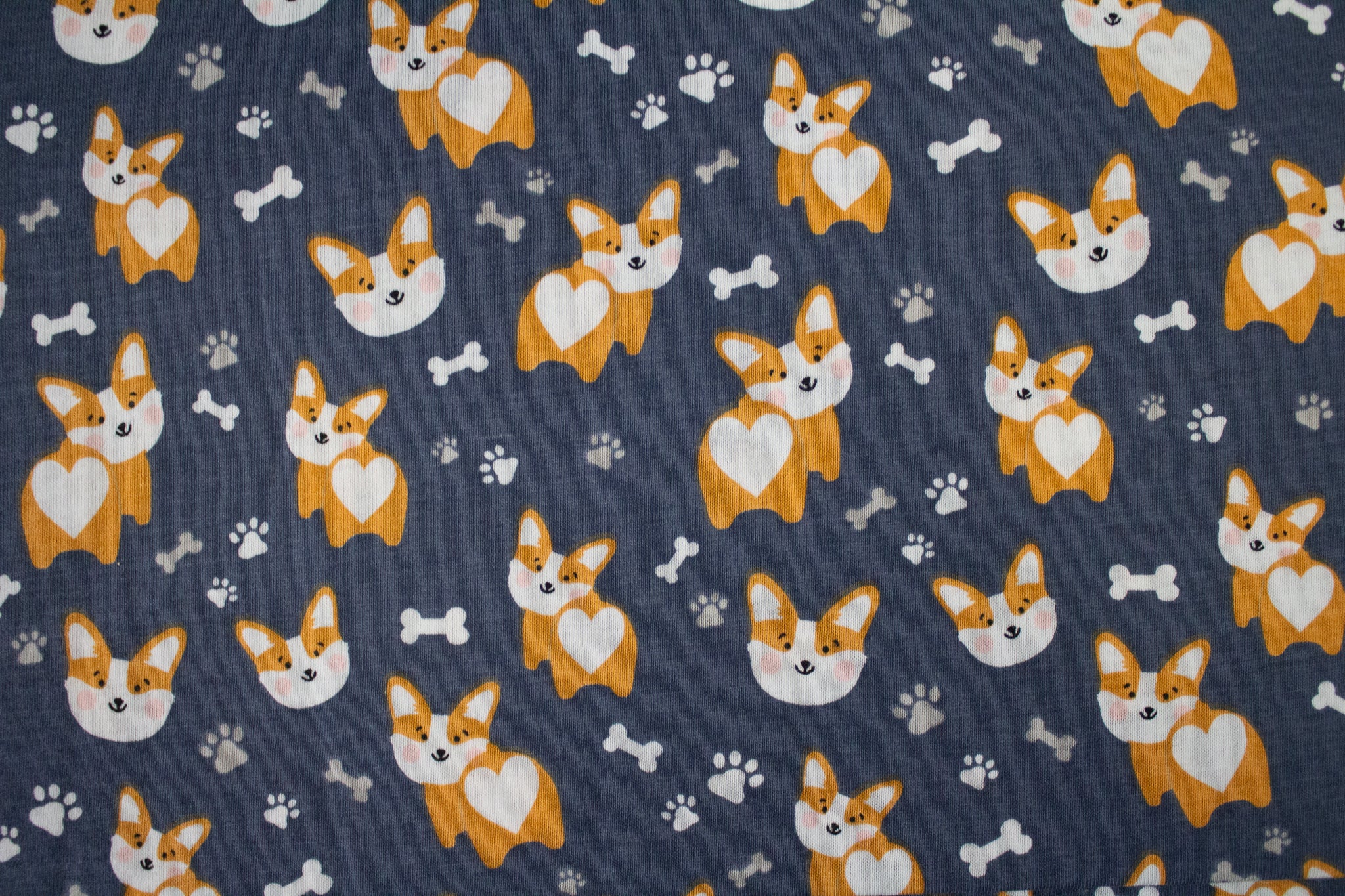 Corgi dogs on dark blue cotton jersey knit. Soft to the touch! POP! branded fabric.