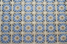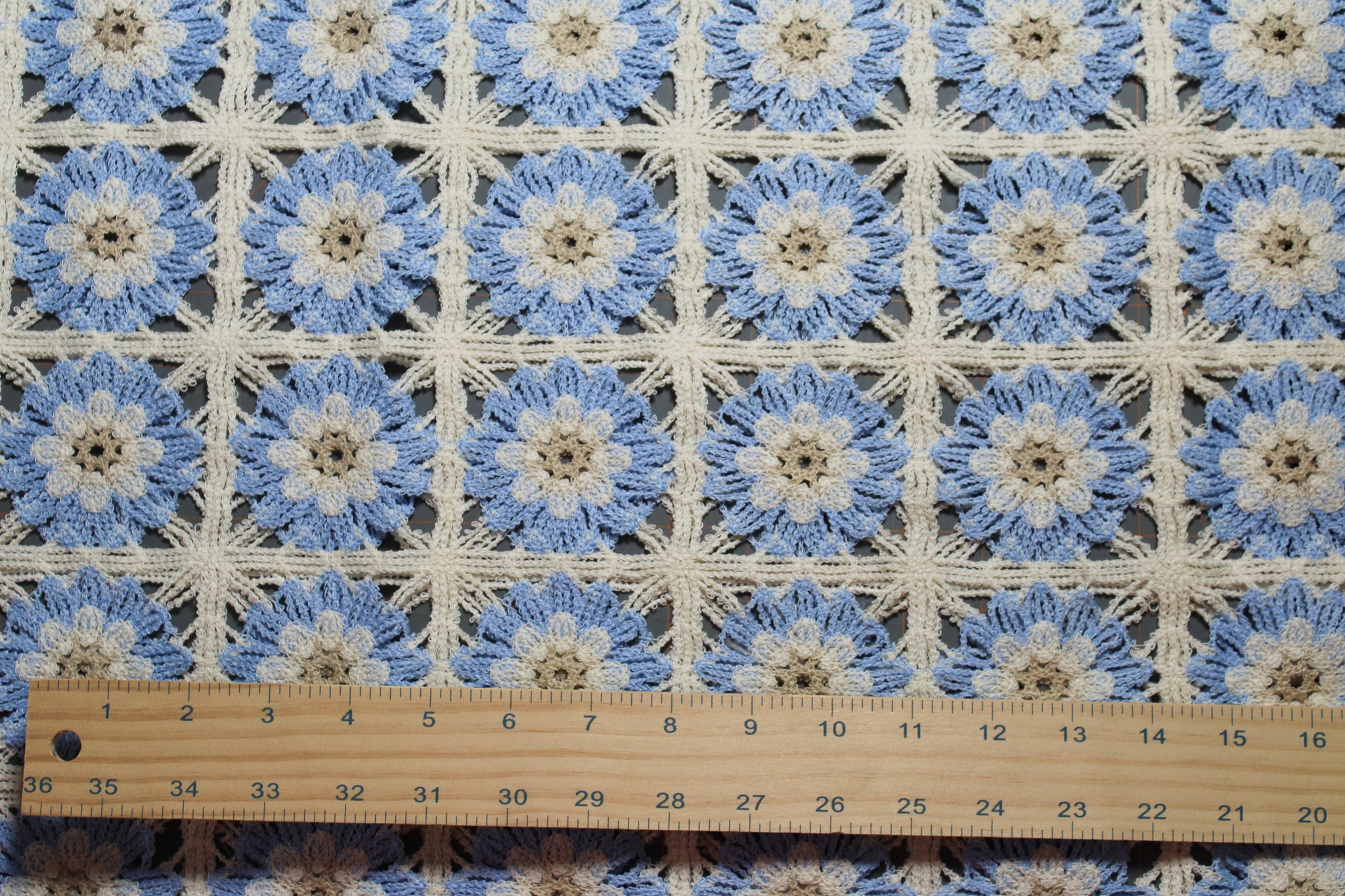 Blue and white flower crochet in square stacked pattern. Material is see-through. Open holes between the lines of crochet (note the gray background is the mat below the fabric).