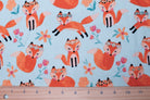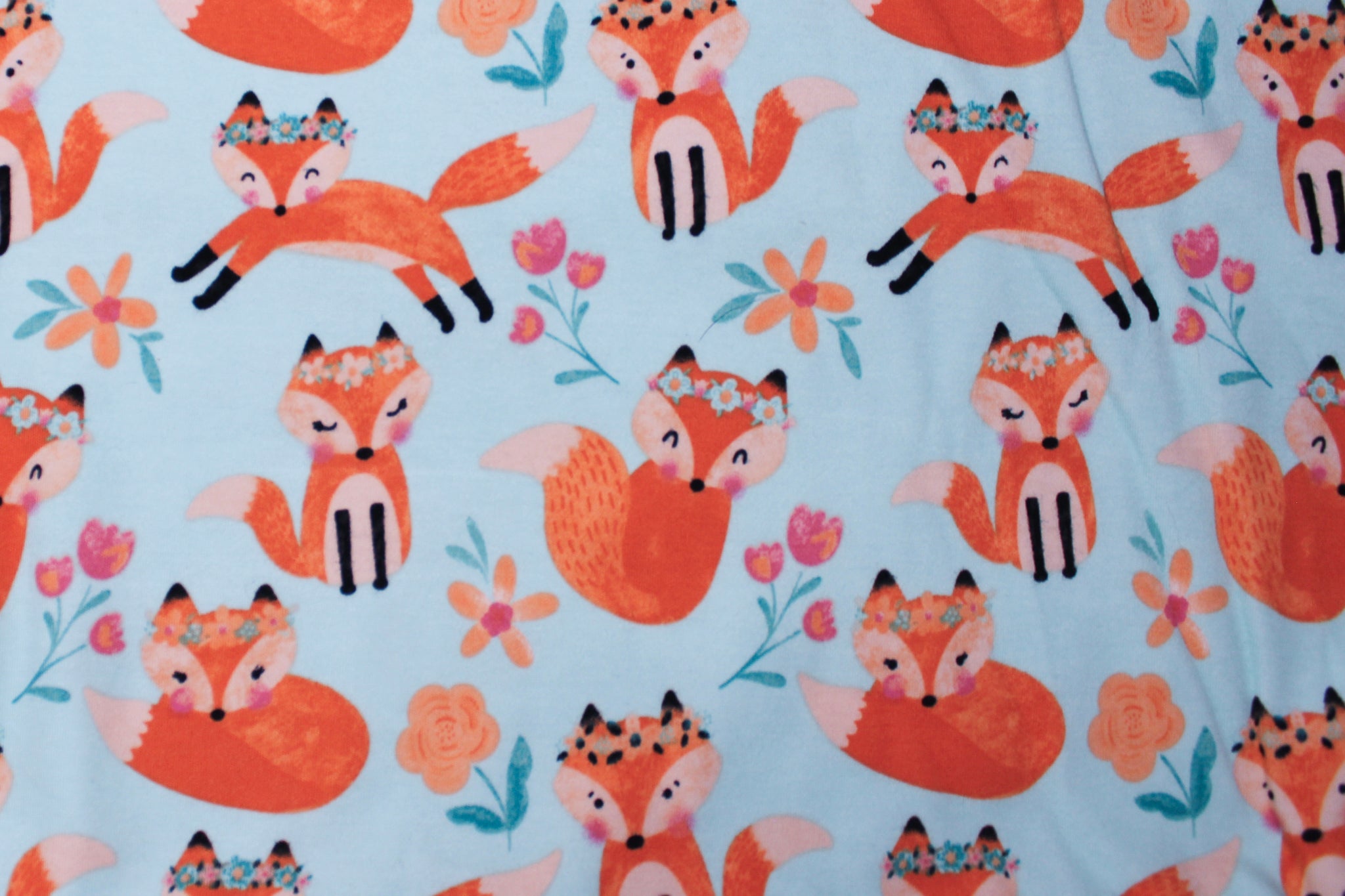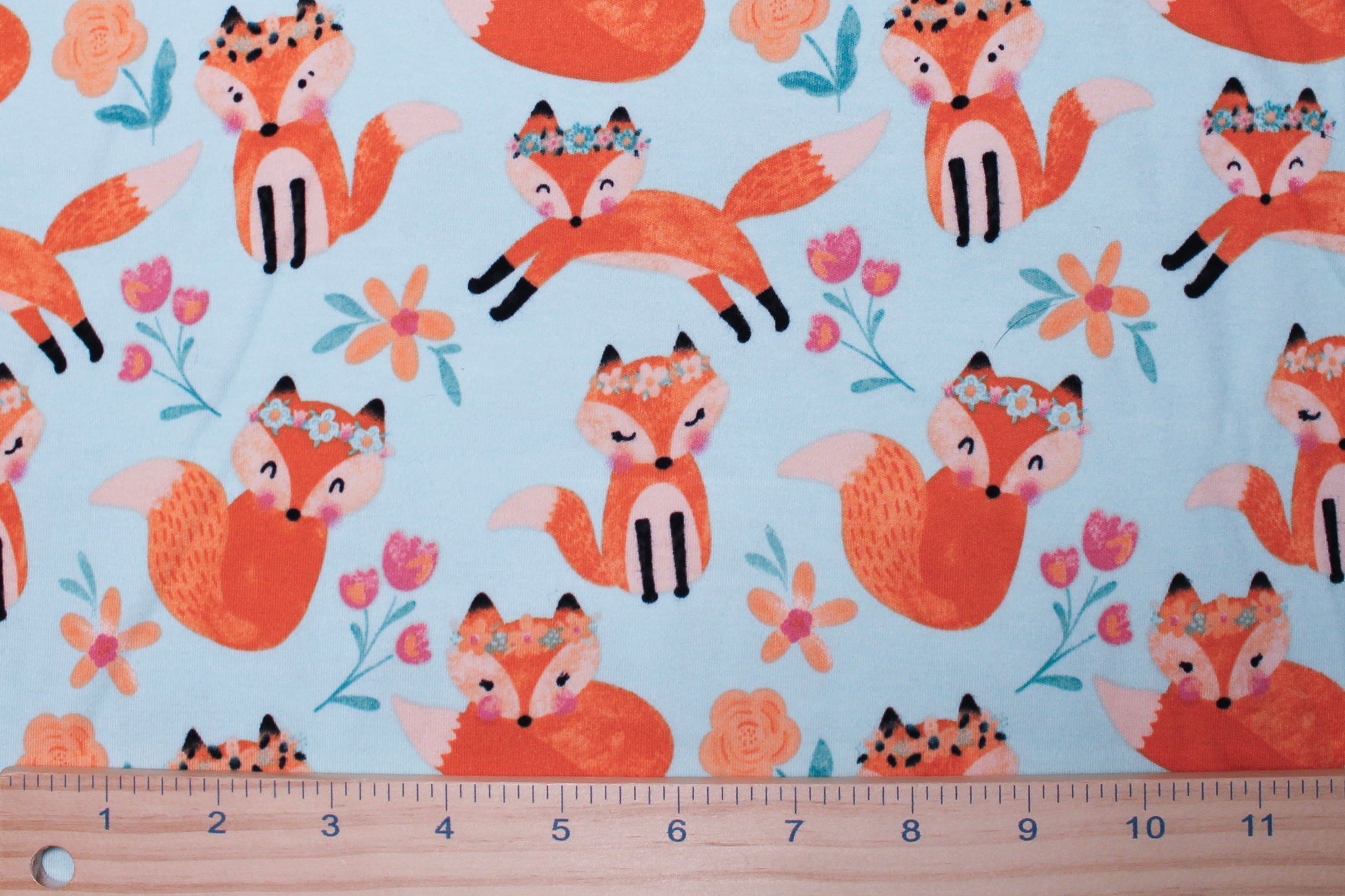 Foxes with floral crowns on light blue cotton interlock knit. Soft to the touch! POP! branded fabric.