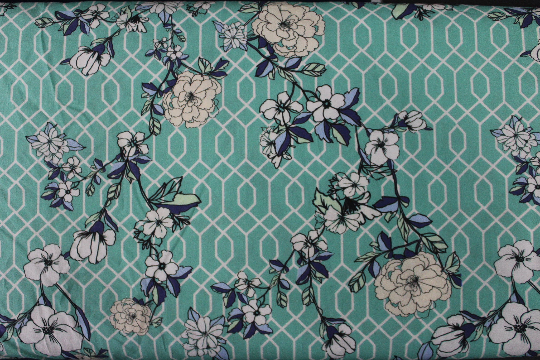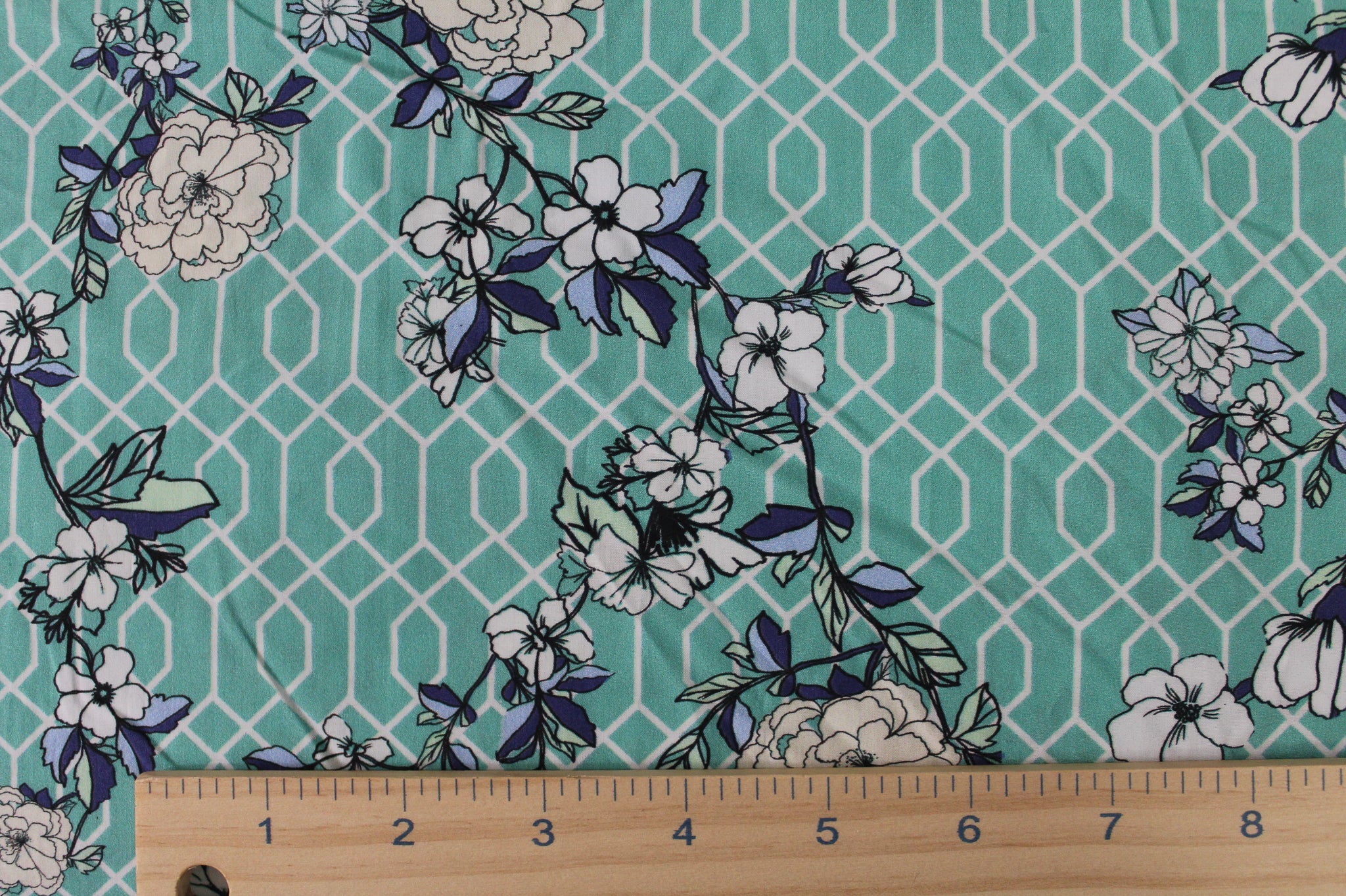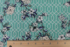 Mood exclusive La Fortuna green cotton. White geometric print on green background with floral vines across the fabric. This is a recovered fabric.