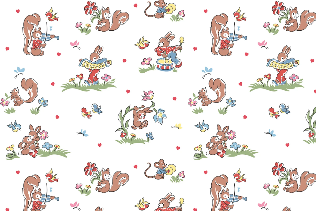 This charming fabric features a delightful array of woodland creatures, including squirrels, rabbits, and mice, each engaged in playful activities amidst a backdrop of vibrant flowers and fluttering butterflies. The design is set against a crisp white background, adorned with small red hearts, creating a whimsical and endearing pattern perfect for a variety of sewing projects, from children's clothing to home decor.