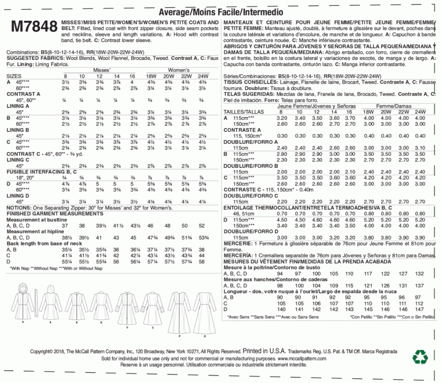 McCall's M7848 - Misses'/Miss Petite/Women's Petite Coats and Belt.