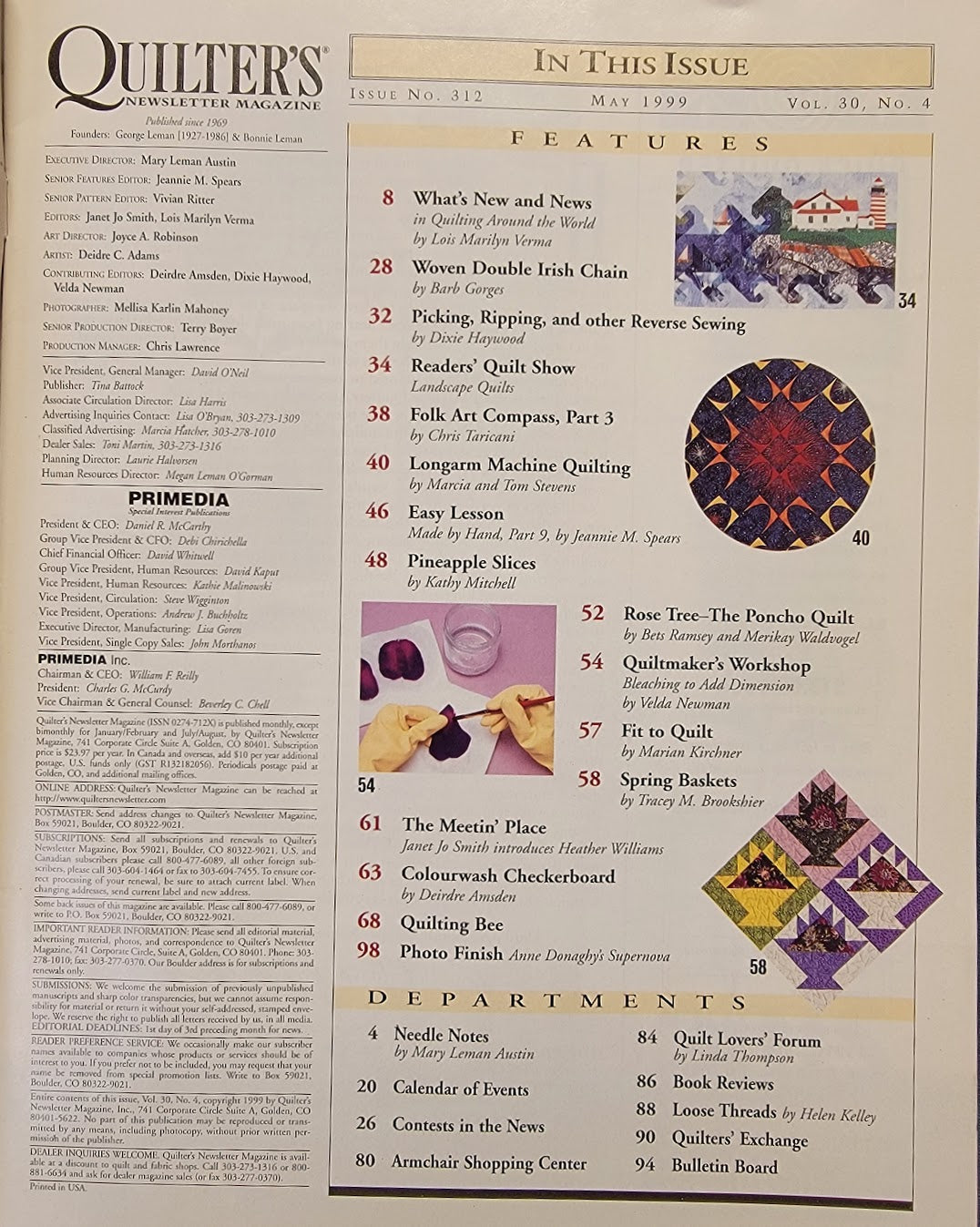This is a recovered Quilter's magazine issued May 1999. The magazine is in good shape and is 98 pages. Inside are quilt patterns, product reviews, and quilting tips and tricks!