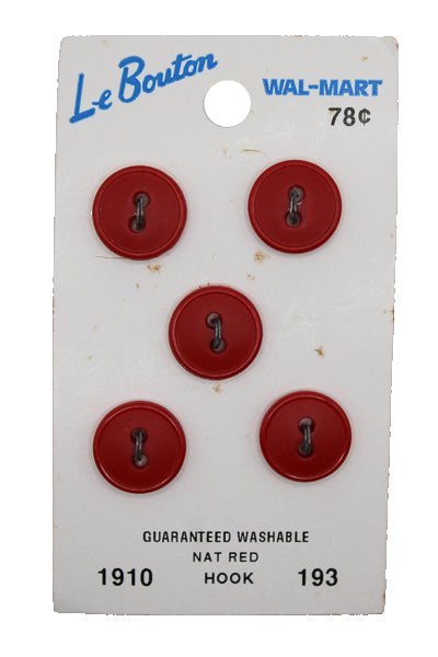 Package of 5 red, circular buttons. Style number 193. There are 2 holes to attach button to fabric. This is a recovered product!