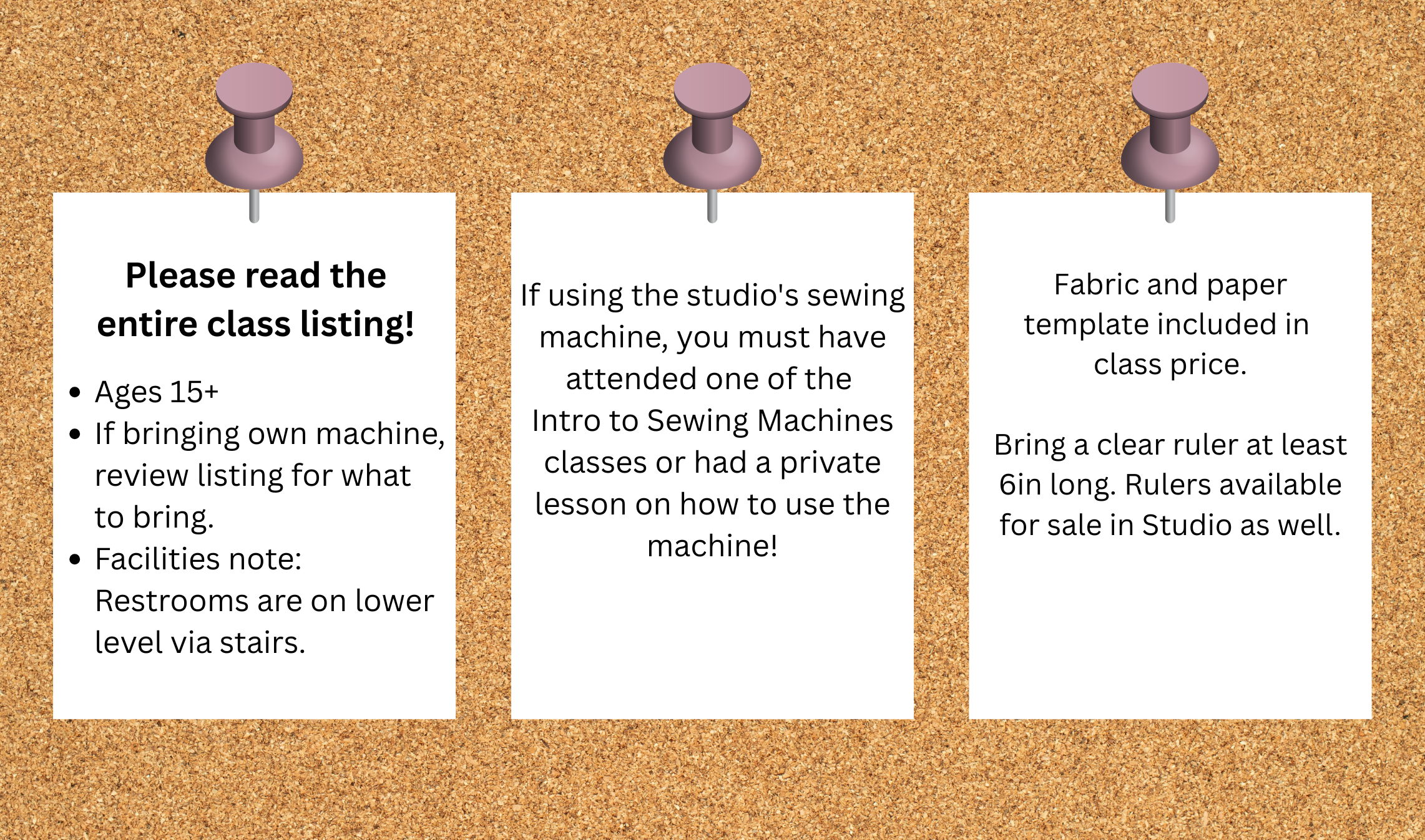 The studio will have seam rippers, pins, clips, scissors, and irons available for use during class.