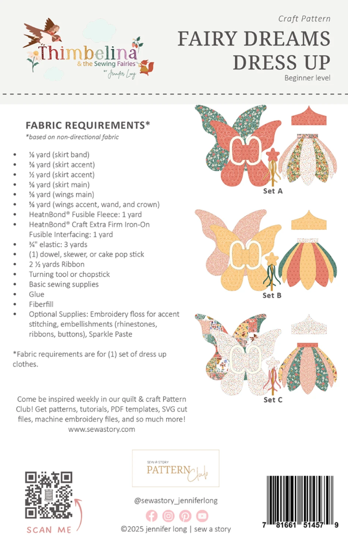 Transform playtime into a magical adventure with the Fairy Dreams Dress-Up Set. This pattern includes a crown, wings, wand, and adjustable skirt, all designed with enchanting details and fabrics from the Thimbelina collection. Perfect for fostering imaginative, screen-free play, this set invites children to step into a world of fairy-tale fun. Thoughtfully sized, the crown, wings, and wand are easy to craft, while the adjustable skirt ensures a great fit for growing kids. The pattern includes detailed instructions for using Peltex stabilizer, fusible fleece, and ribbon, ensuring a sturdy and polished finish.