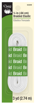Dritz Braided Elastic is the most basic elastic. It is lightweight, slightly ribbed and it narrows when stretched. It is most often used on necklines, sleeves, waistbands and swimwear waistbands and leg bands.