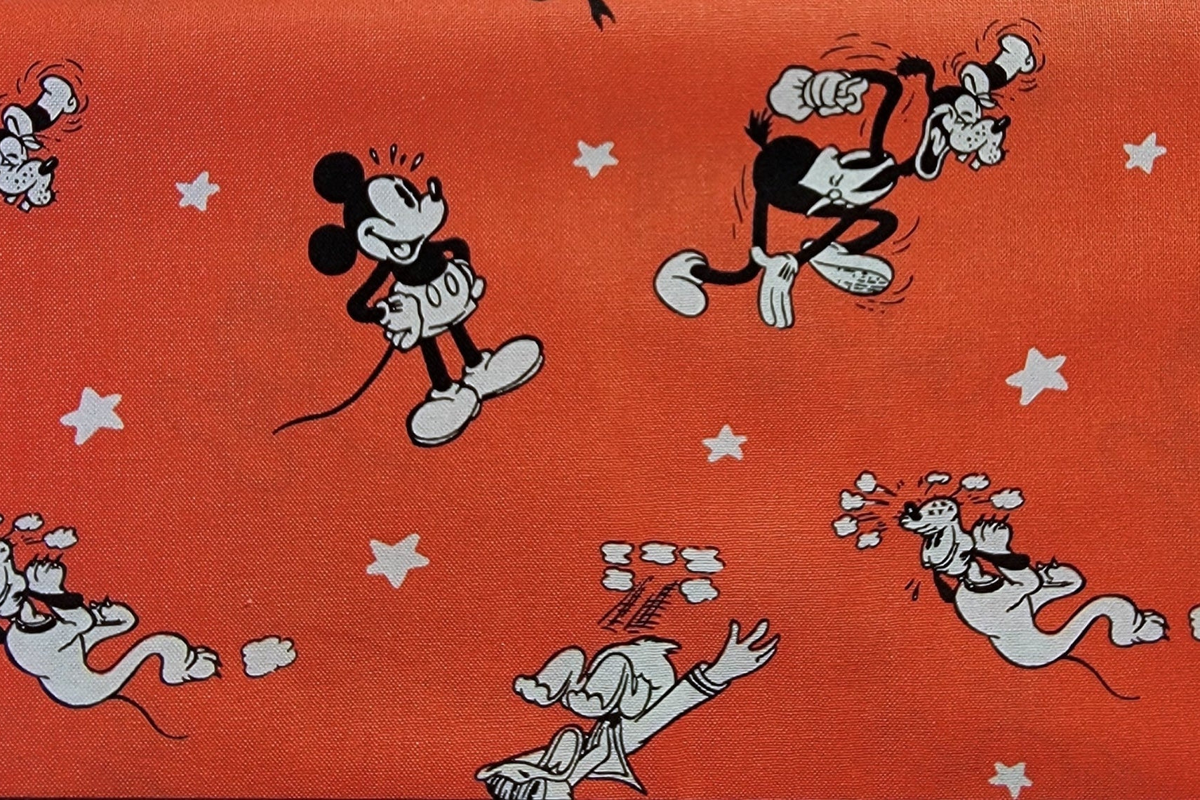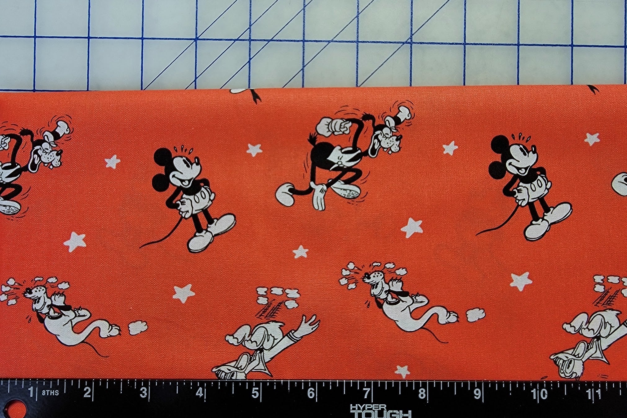 Mickey and friends design on an orange/pink cotton background. This is a remnant