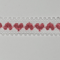 This is a recovered lace trim. Red hearts alternating direction on white lace. Sold as a unit.