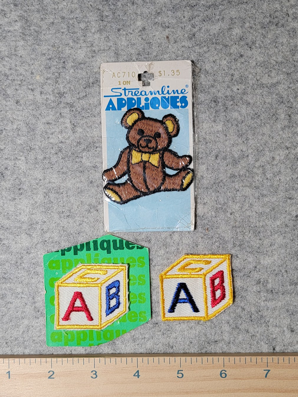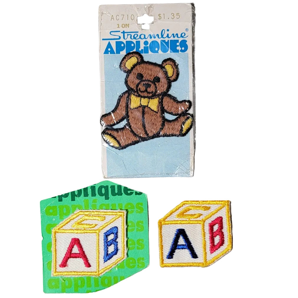 Three recovered appliques. 2 letter blocks and one bear. These appear to be unused. There are no instructions - could be iron on or sew on appliques.