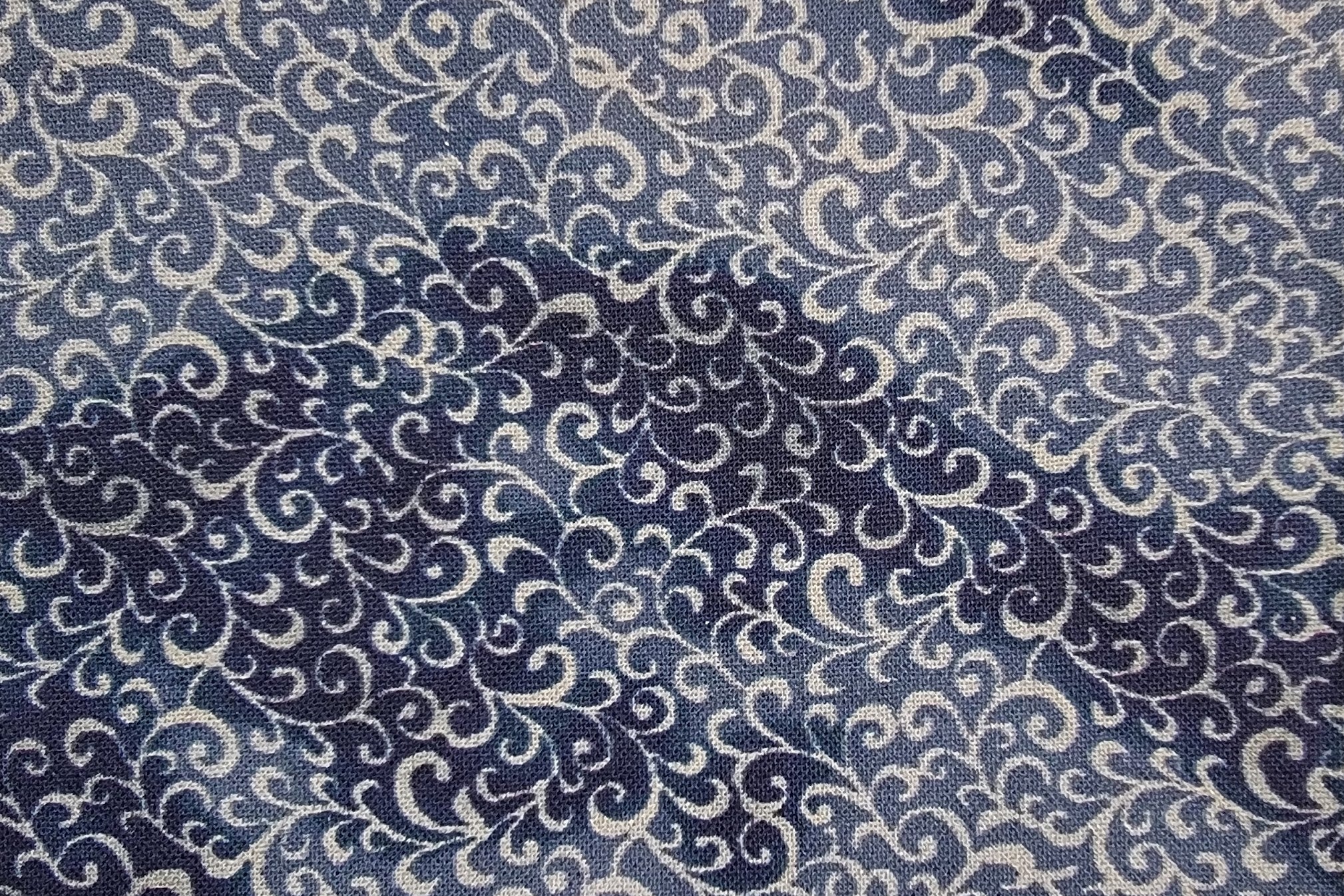 Silver scroll design on dark blue cotton background. This is a recovered fabric.