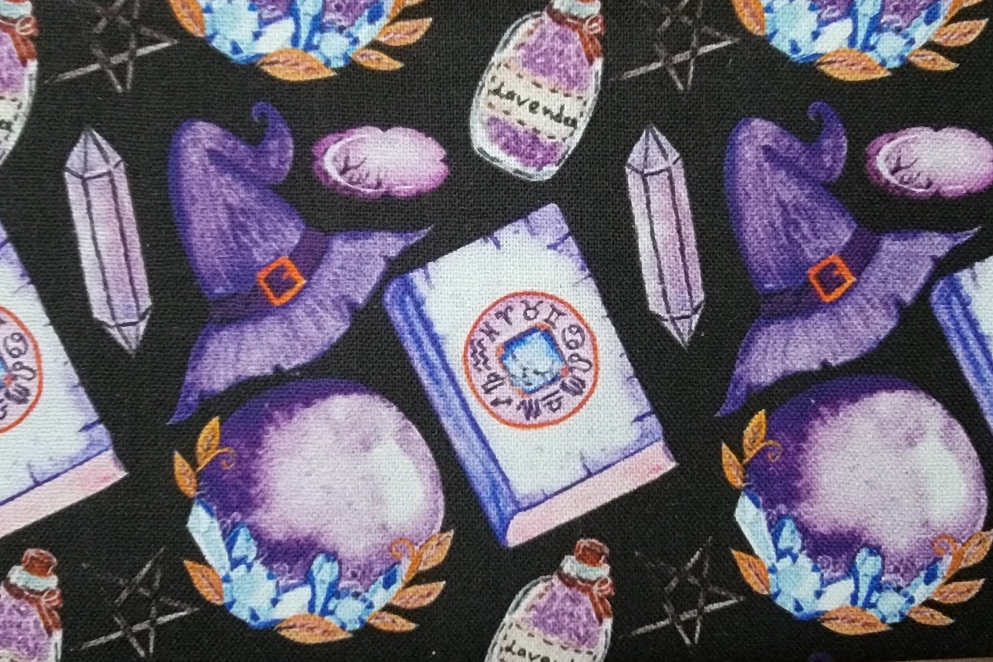 Purple spooky season design with witches' hats, spell books, and crystals on a black cotton background. Fat Quarter (18" x 21").