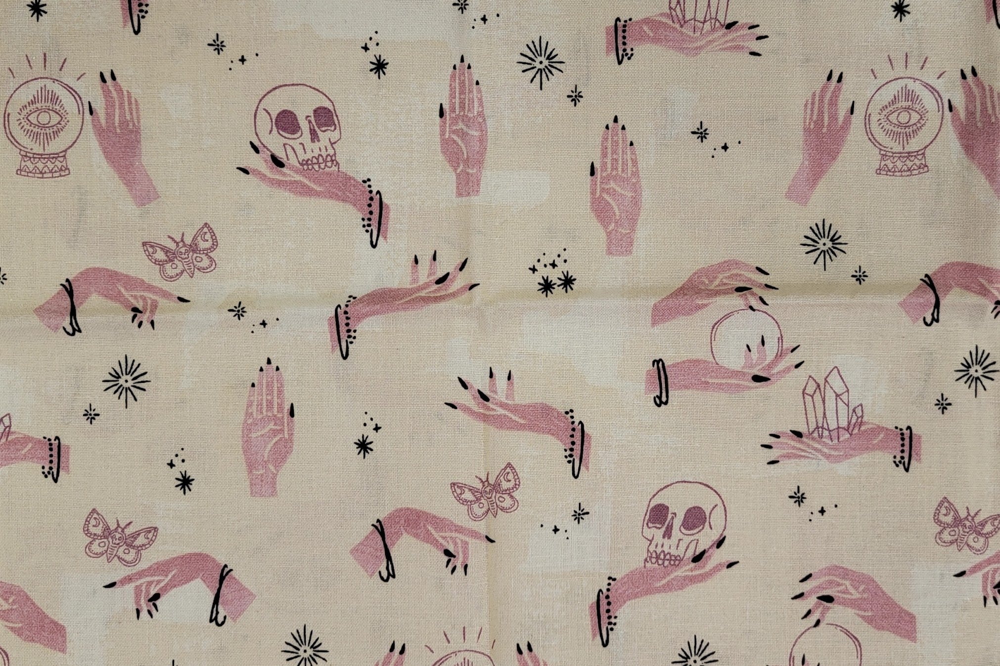 Purple hand, skull, and crystal ball designs on an ivory cotton background. This is a recovered fabric.
