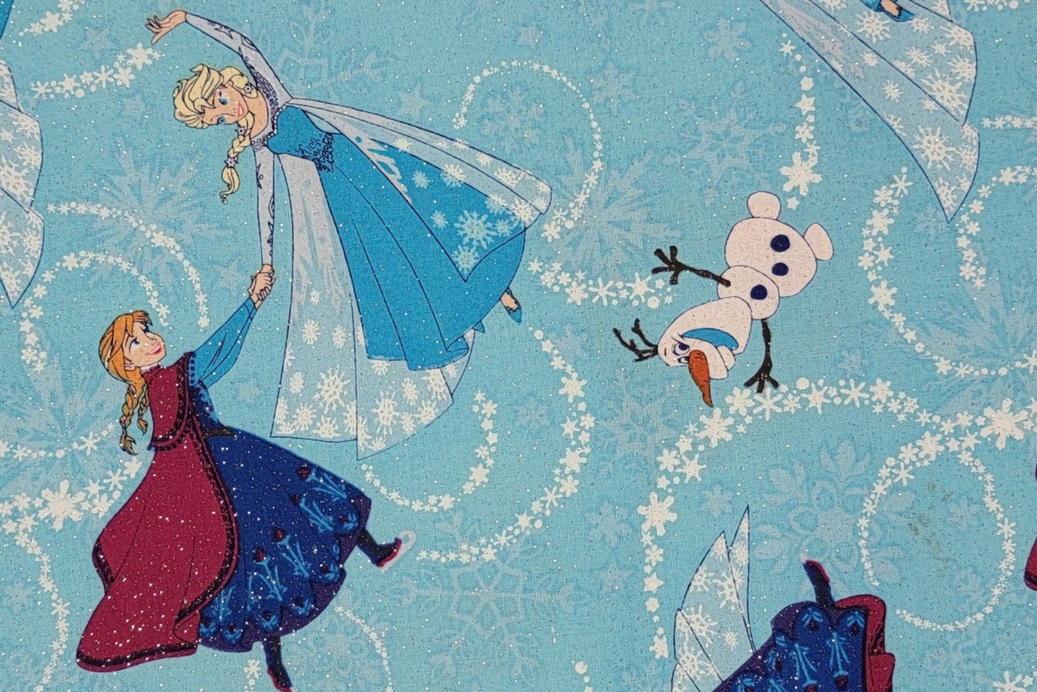 Elsa and Anna with Olaf on a blue sparkle cotton background. This is a recovered 1 yard cut.