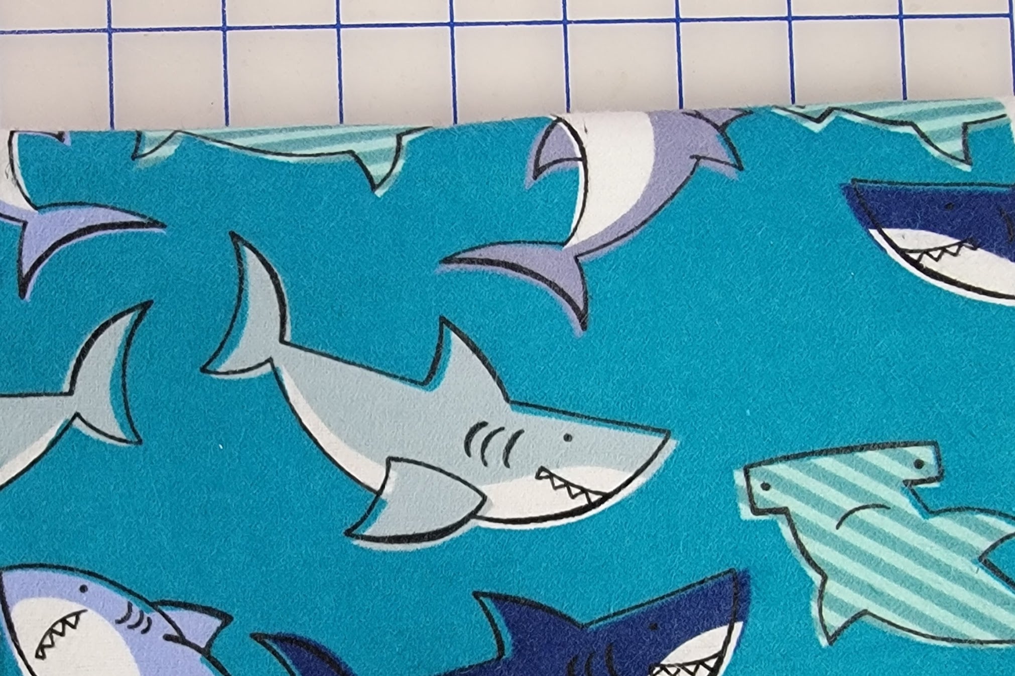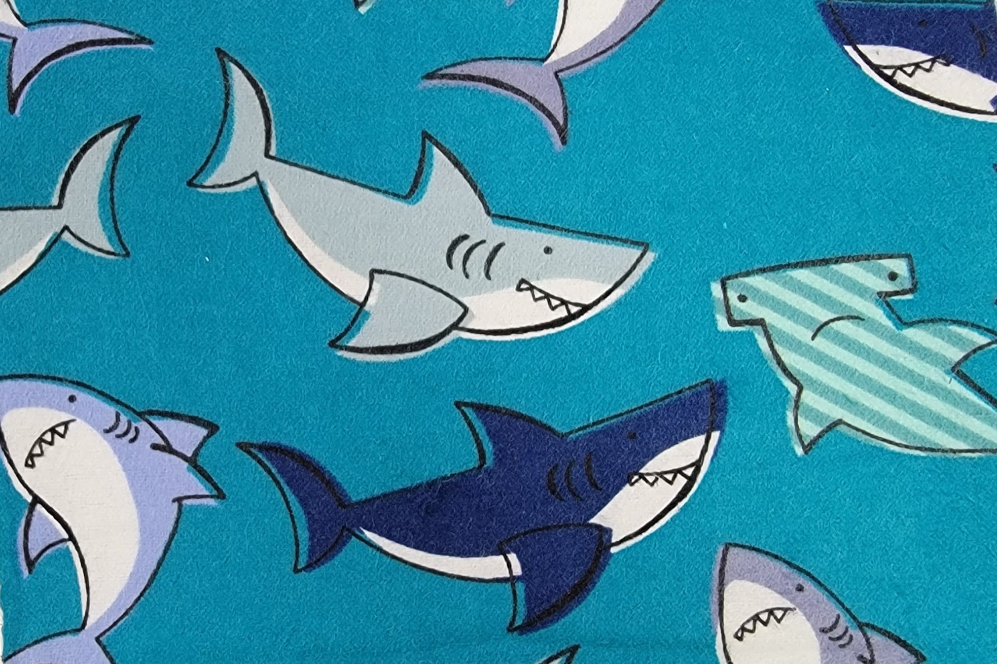 Variety of sharks on a blue cotton flannel background. This is a recovered fabric.