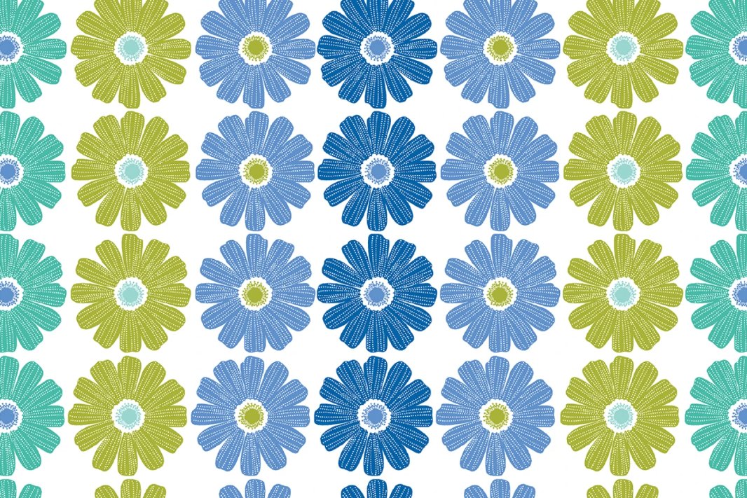 Ombre blue and green daisies on a white cotton background. Chalk Garden collection.