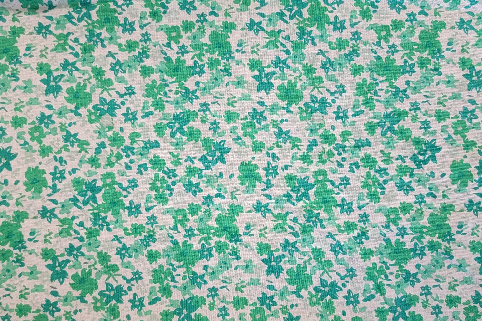 Small green floral design on a white cotton background. This is a recovered fabric.