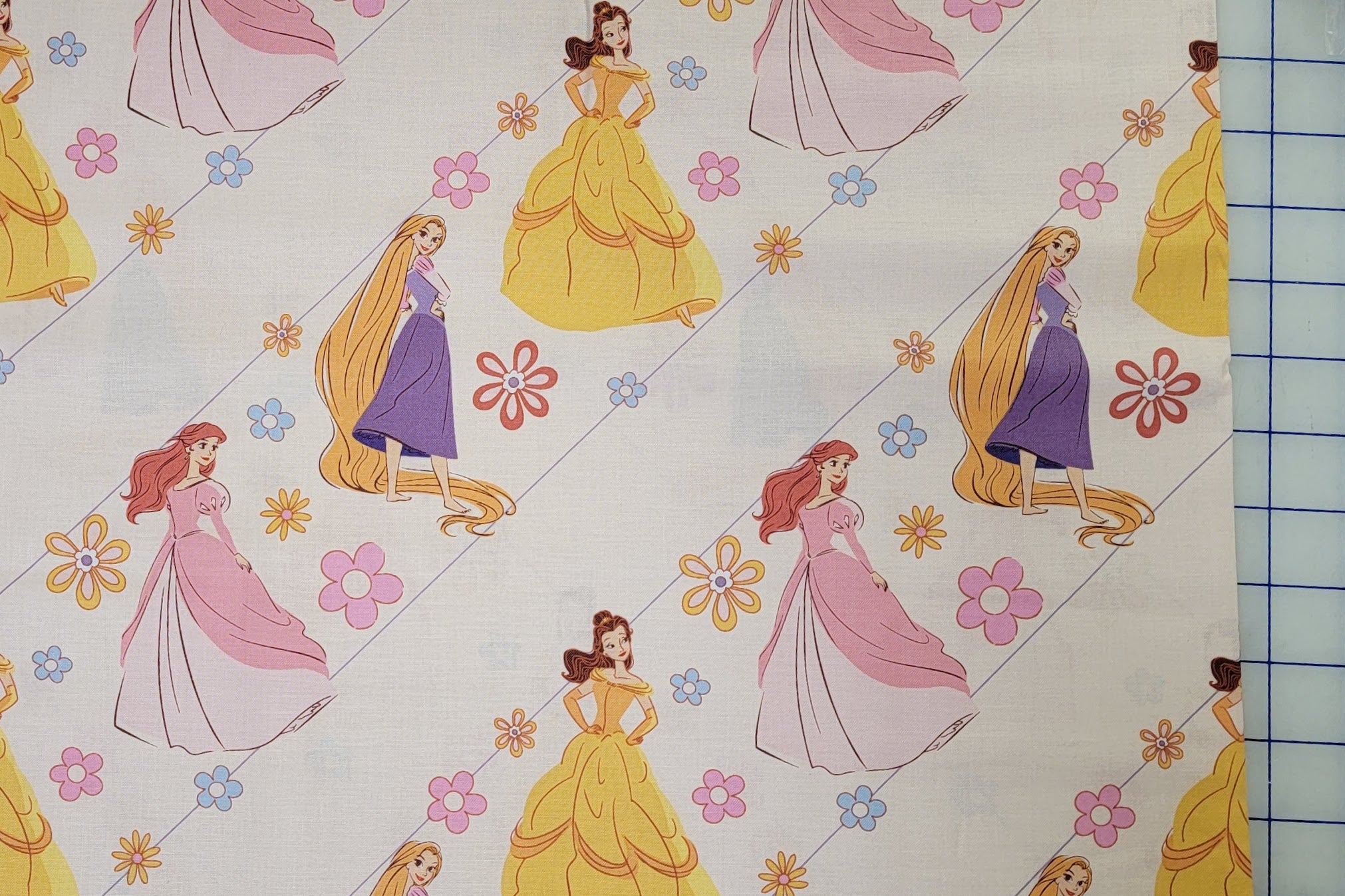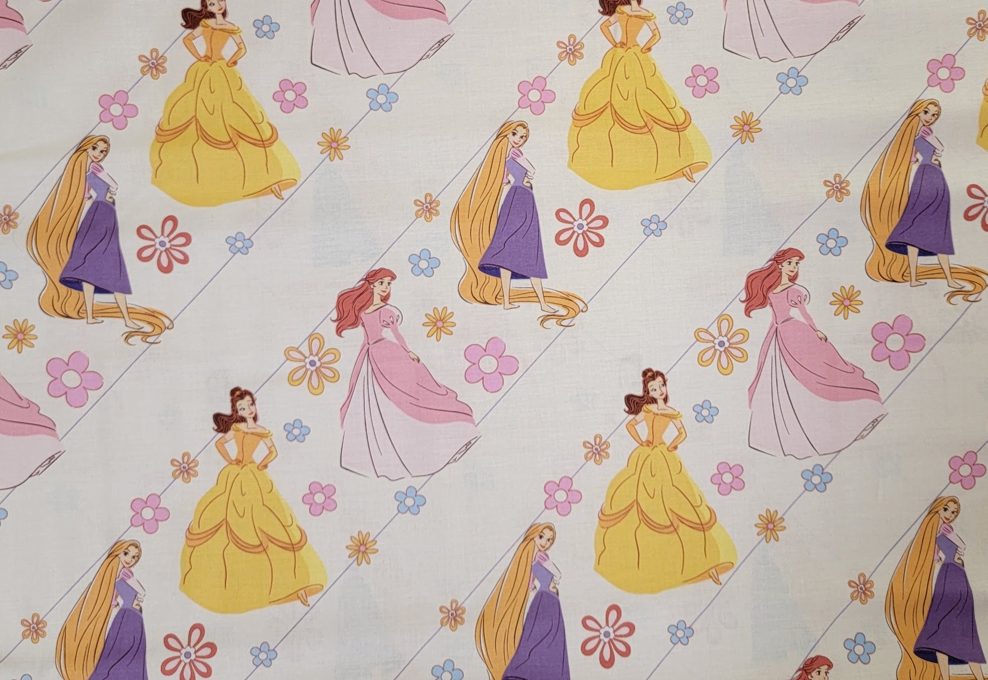 Discover the enchanting allure of this pastel princess cotton fabric, perfect for adding a whimsical touch to your crafting projects or upholstery accents. Featuring beloved Disney-inspired characters like Rapunzel with her flowing golden locks in a lavender gown, Belle in her iconic yellow ballgown, Ariel with her fiery red hair in a soft pink dress, and Cinderella in blue elegance, all surrounded by delicate floral motifs in shades of pink, yellow, orange, and blue. The light pastel background with subtle diagonal lines creates a dreamy, fairy-tale vibe, ideal for quilting, pillow covers, or children's room decor. This soft, 100% cotton weave offers comfort and durability, making it a must-have for sewers and designers seeking vibrant yet gentle patterns that spark joy and creativity in every stitch.