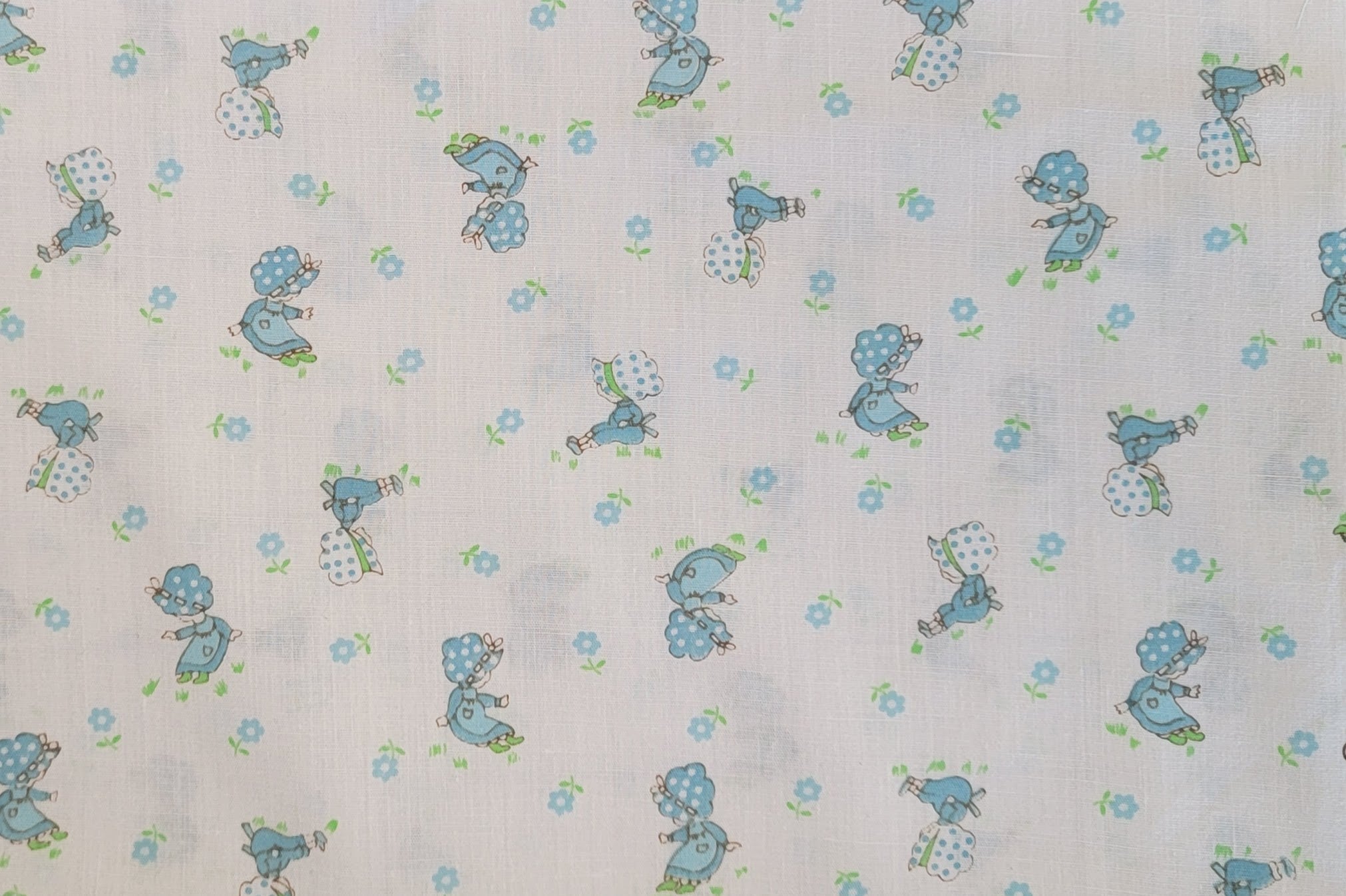 Blue girl design on a white cotton. This fabric is slightly sheer (see last photo). This is a recovered Spring Mills, Inc. fabric that has been previously washed.