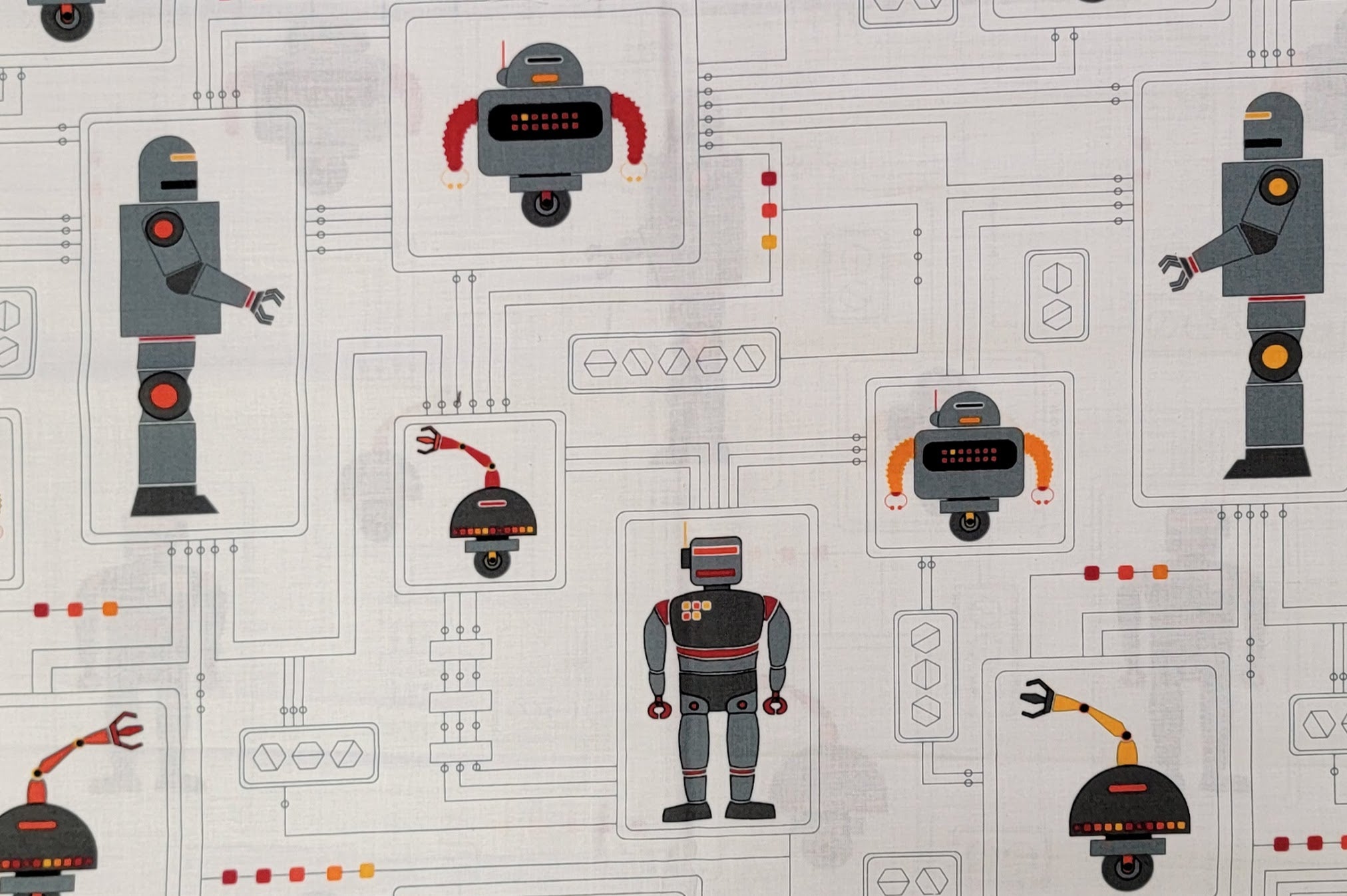 Robot print on a white cotton background. This is a recovered Timeless Treasure brand fabric.