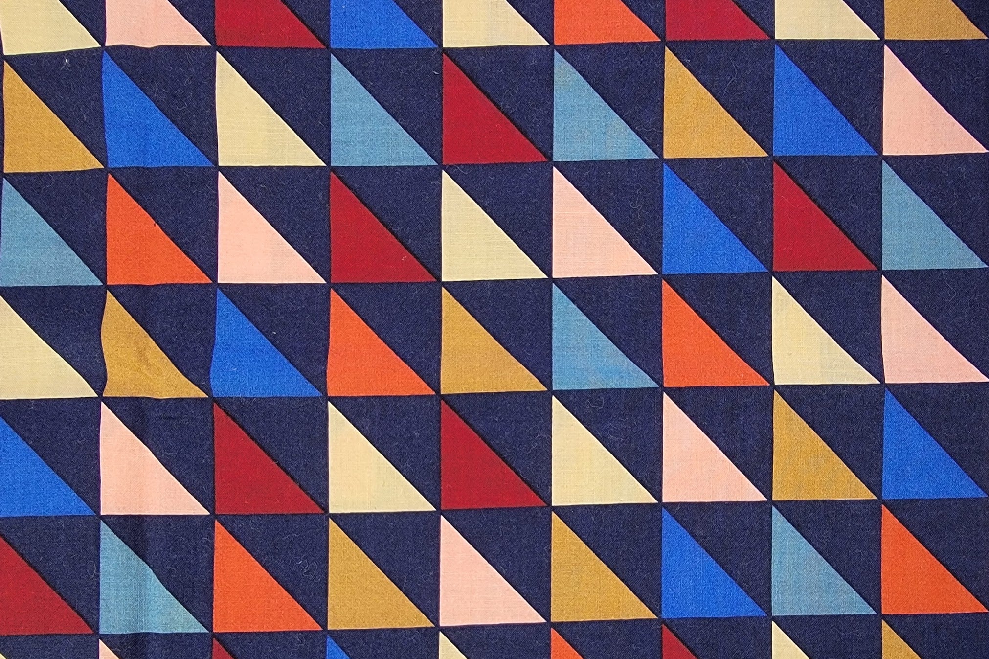 Navy blue and colorful half-square triangle cotton. This is a recovered fabric that has been previously washed.
