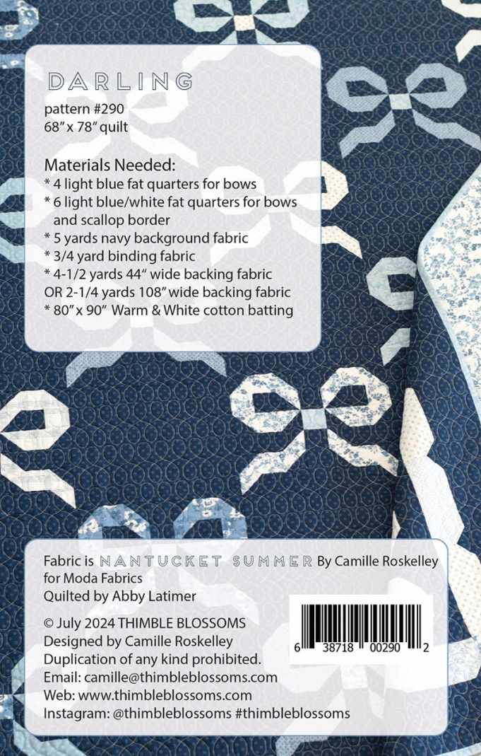 A sweet 68” x 78” fat quarter friendly bow quilt. Nantucket Summer fabric collection by Camille Roskelley (not included, pattern only). Full color pattern.