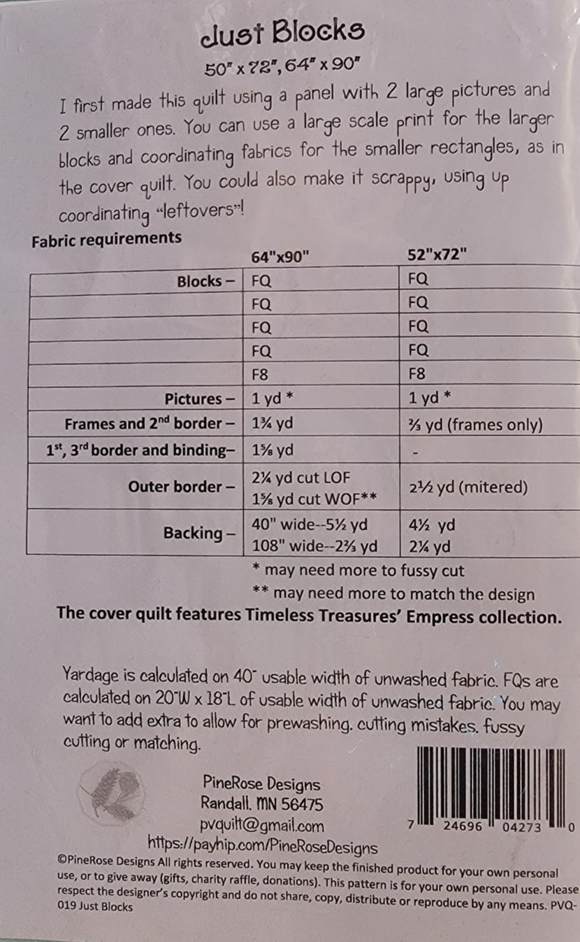 Recovered quilt pattern "Dust Blocks" by PineRose Designs. Appears unused. Materials list on back cover. This is for the pattern only, no fabric included.