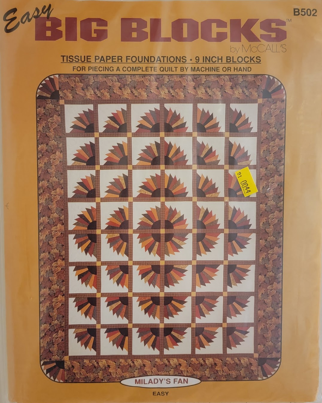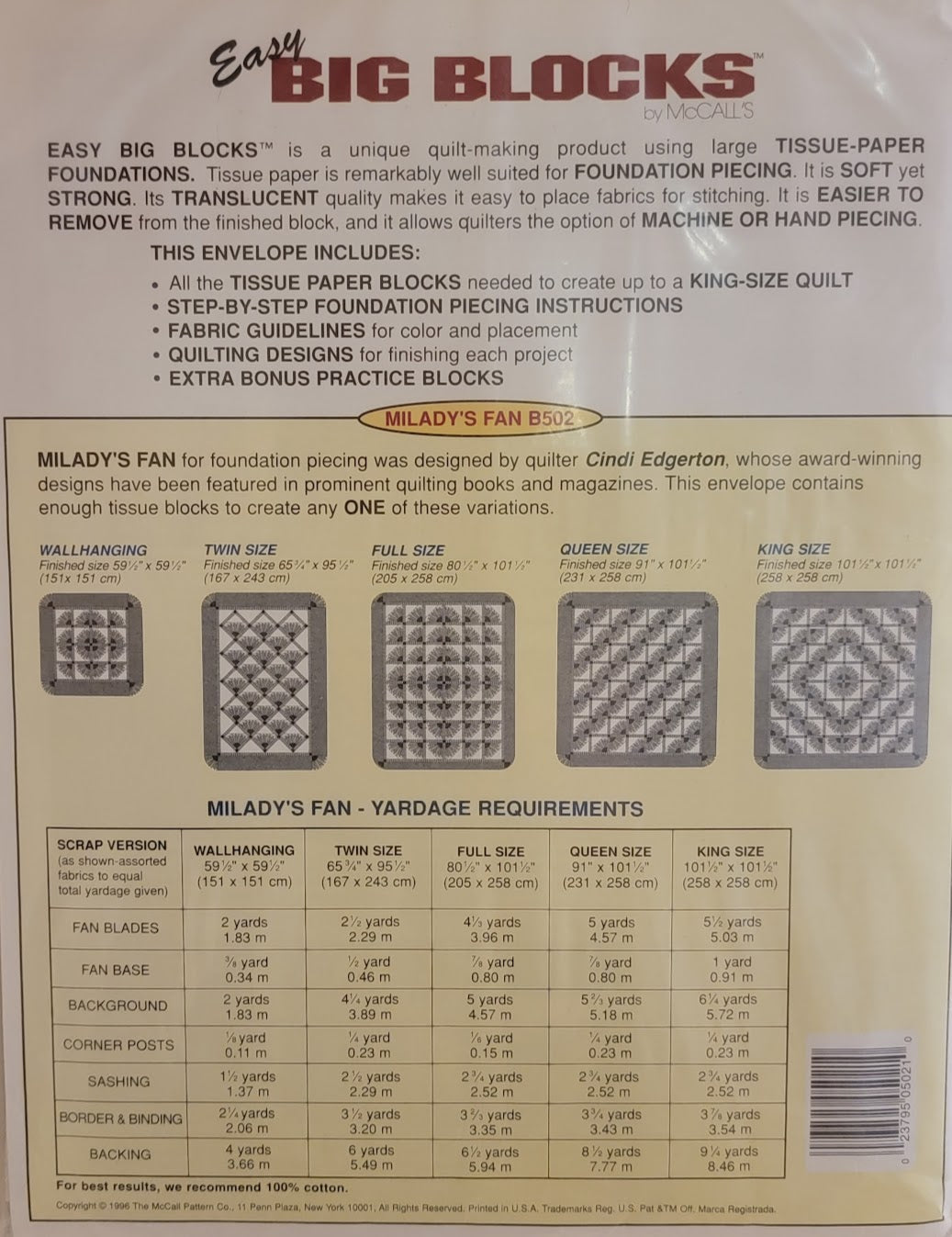 Recovered McCall's Big Blocks "Milady's Fan". This recovered package contains all the tissue paper blocks needed to create up to a king-sized quilt, instructions, fabric guidelines, and quilting designs. Appears unused. Materials list on back cover. This is for the pattern only, no fabric included.