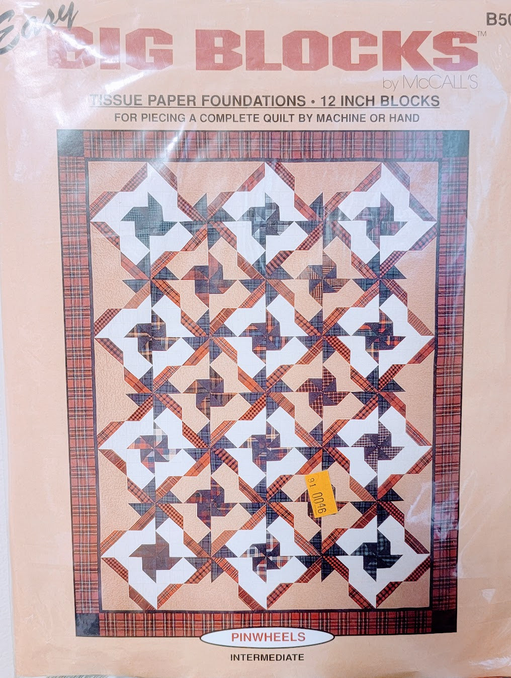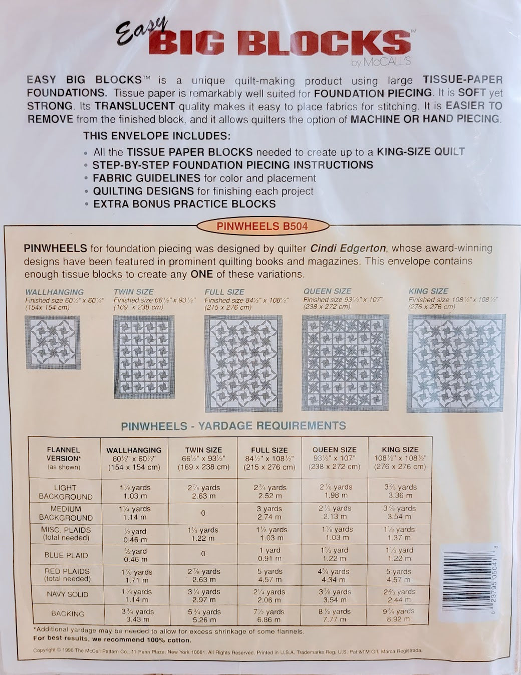 Recovered McCall's Big Blocks "Pinwheels". This recovered package contains all the tissue paper blocks needed to create up to a king-sized quilt, instructions, fabric guidelines, and quilting designs. Appears unused. Materials list on back cover. This is for the pattern only, no fabric included.