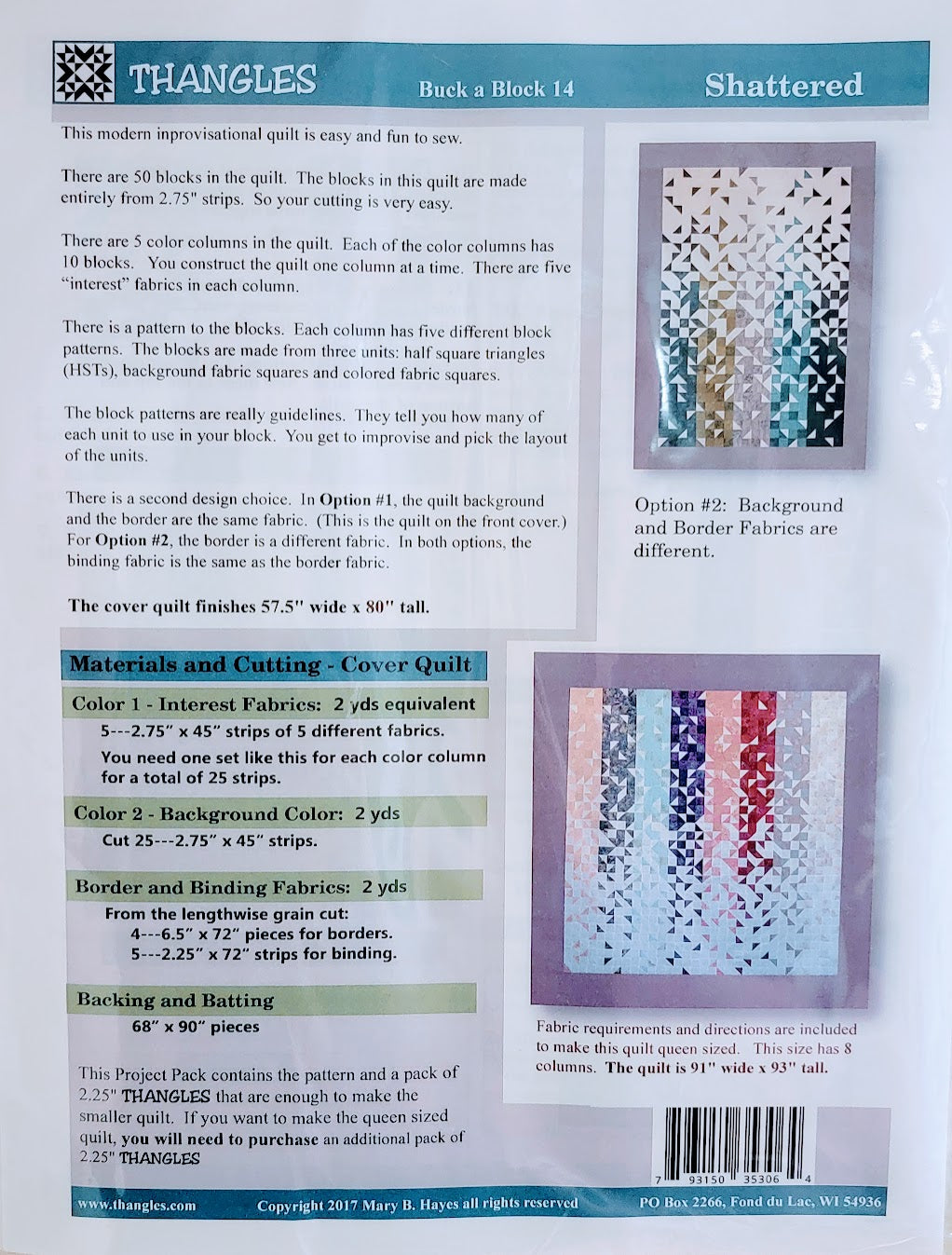 Recovered quilt pattern "Shattered" by Mary B. Hayes. This recovered package contains a pack of 2.25" THANGLES that are enough to make the smaller quilt. Appears unused. Materials list on back cover. This is for the pattern only, no fabric included.