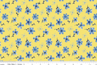 Blue floral print on a yellow cotton background. This is a recovered fabric. Riley Blake line, Sunshine & Dewdrops, C11972 - 2022.