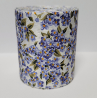 This is a recovered ribbon. Mildly stiff cotton ribbon with small purple flowers on a white background.