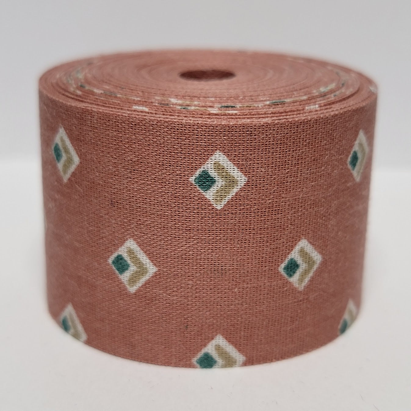 This is a recovered ribbon. Stiff tan ribbon with white diamonds that contain a geometric design.