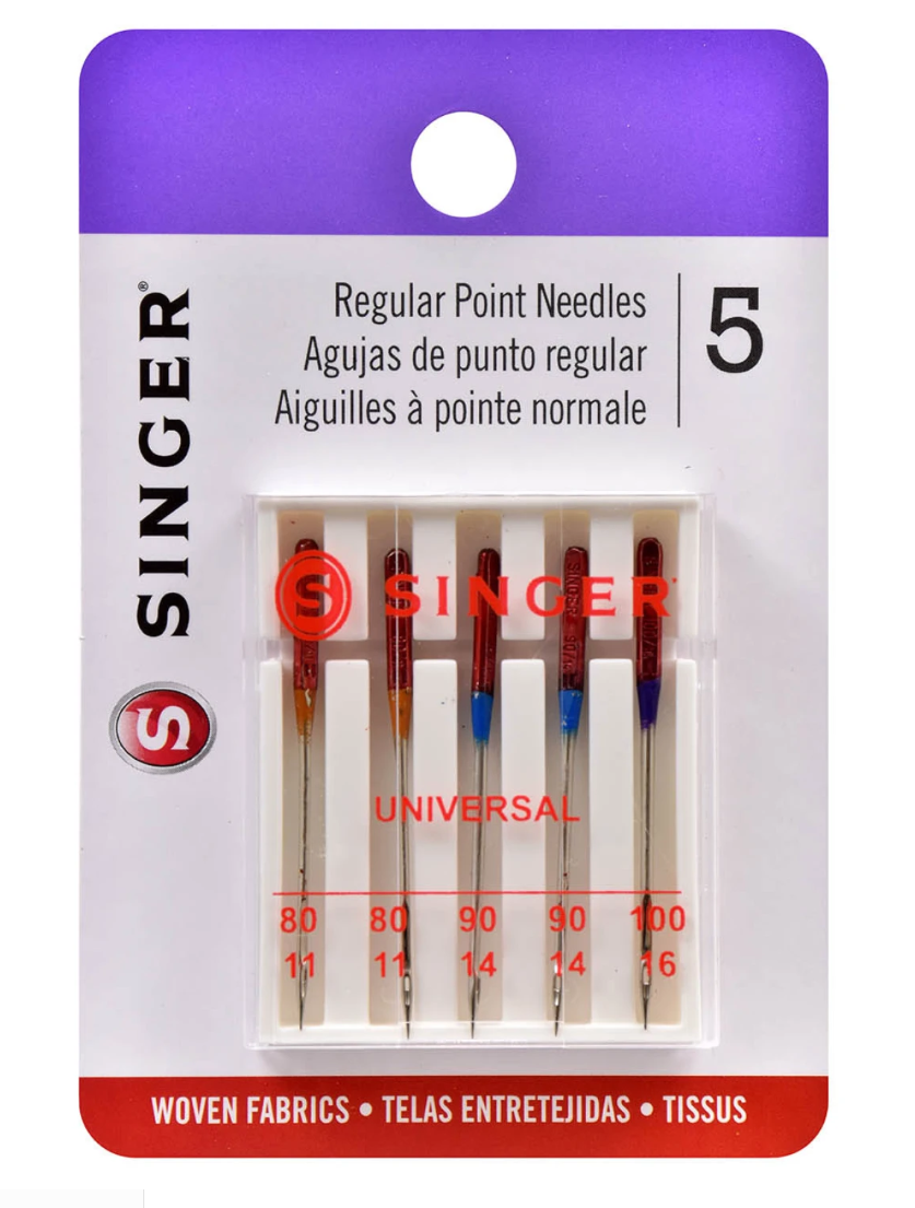 Regular point needles are also called universal needles. They are suitable for all woven and knit fabrics. The larger the size, the heavier the needle. Singer regular point needles are also called "Red Band".