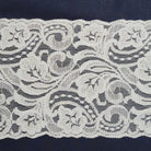 This is a recovered lace trim. White lace with large floral and swirl design.