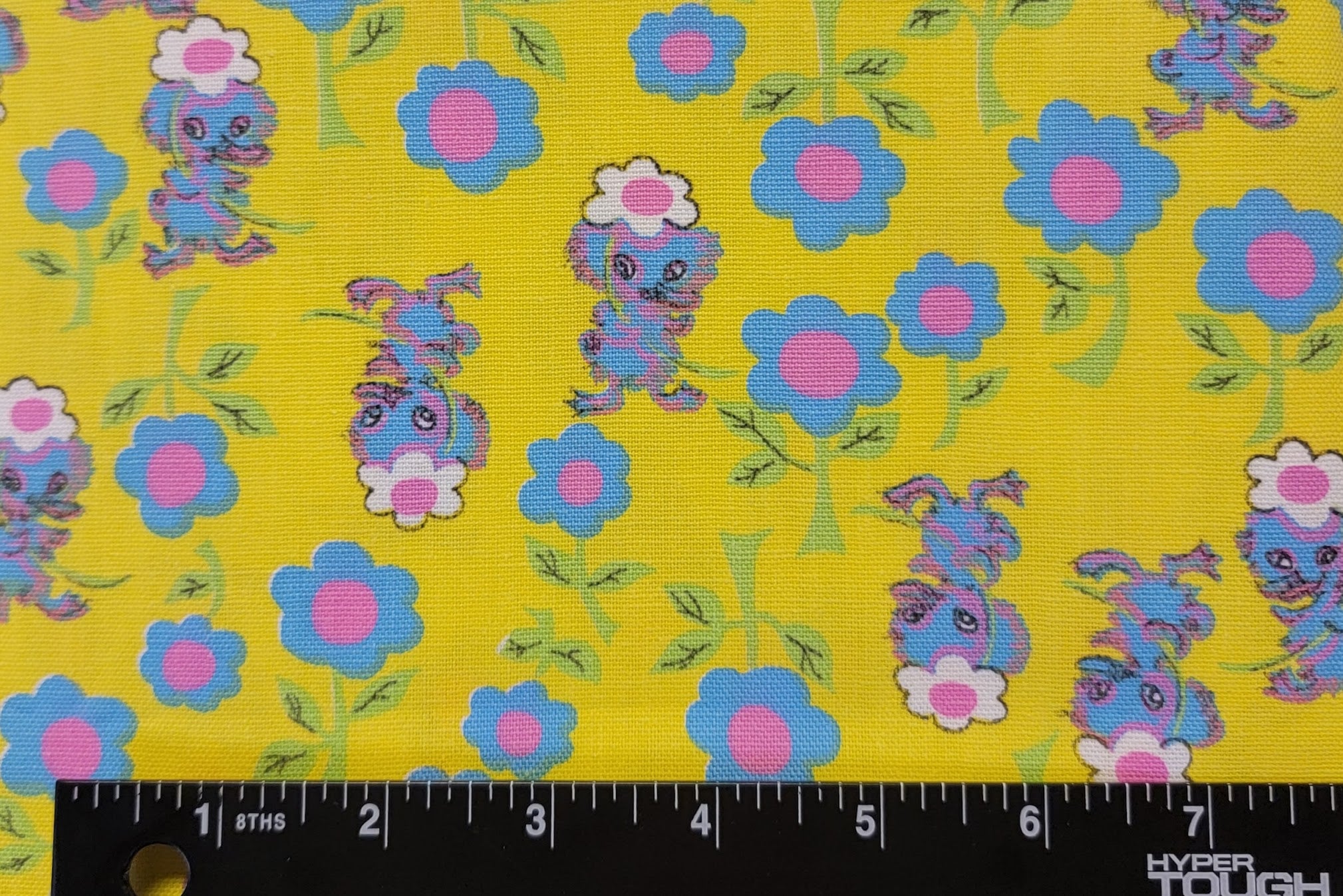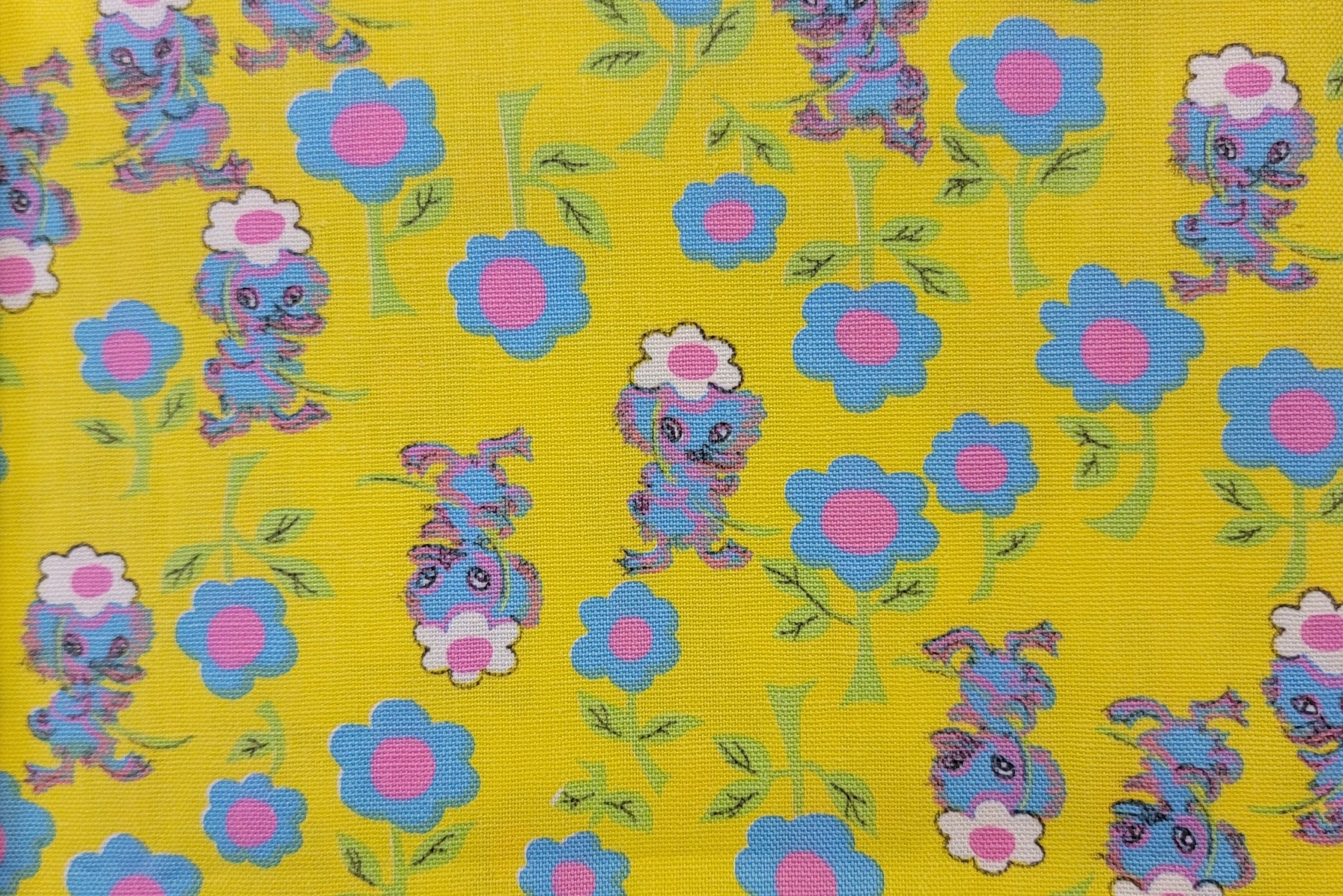 Multi-color ducks on yellow cotton canvas. This is a vintage, recovered fabric.