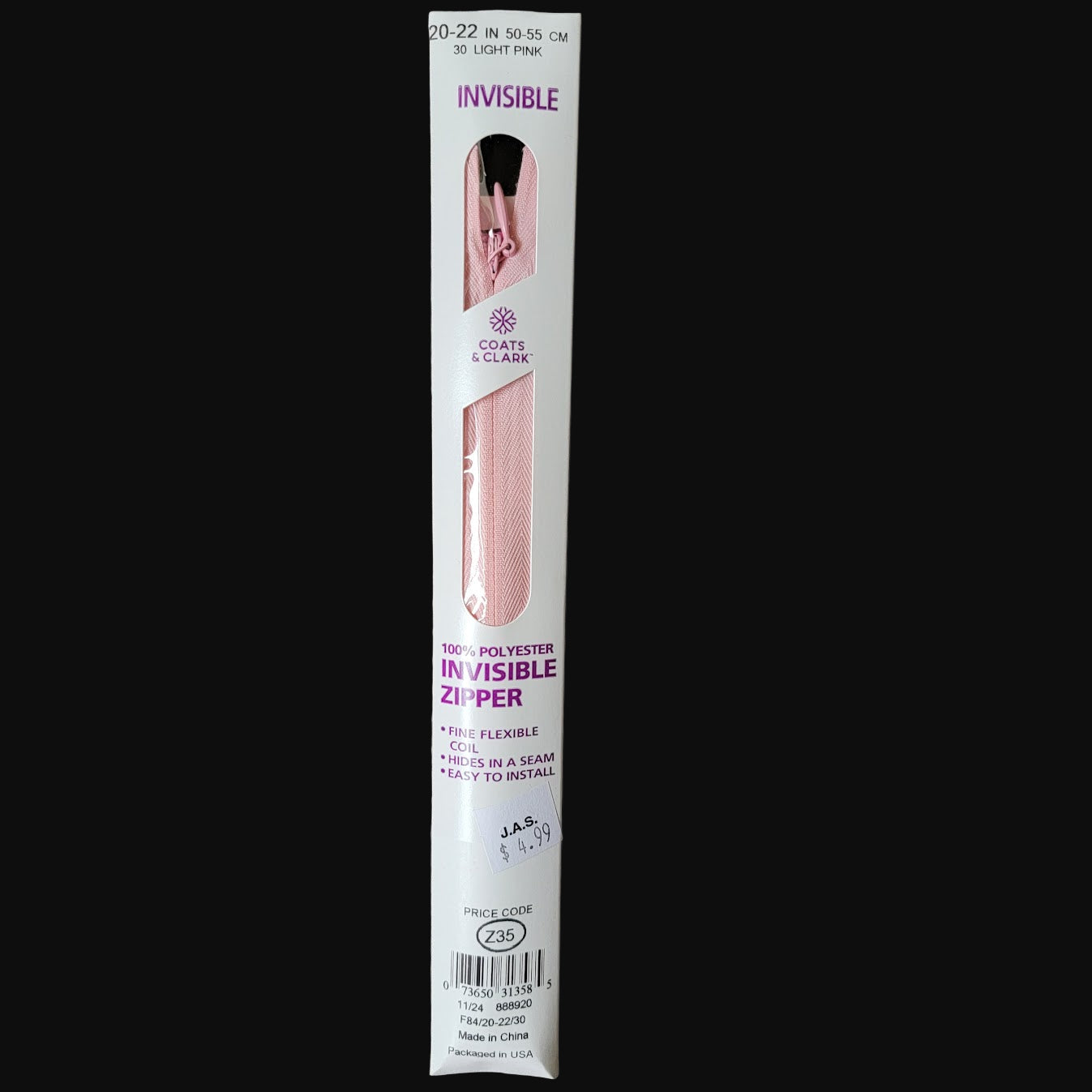 Coats & Clark polyester zipper. Great for apparel projects! This is an unused, recovered zipper!
