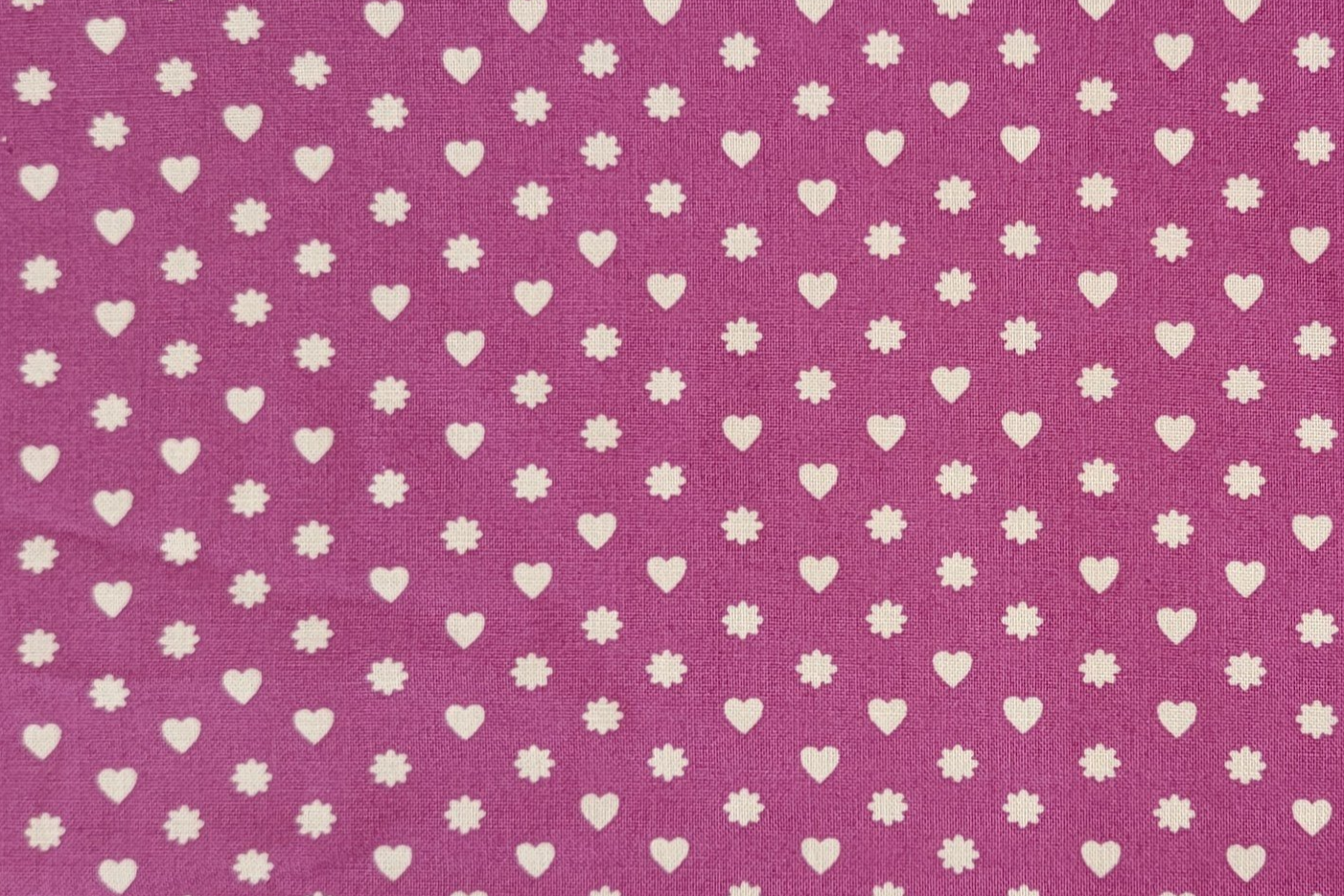 White flower and heart design on purple cotton. This is a recovered fabric!